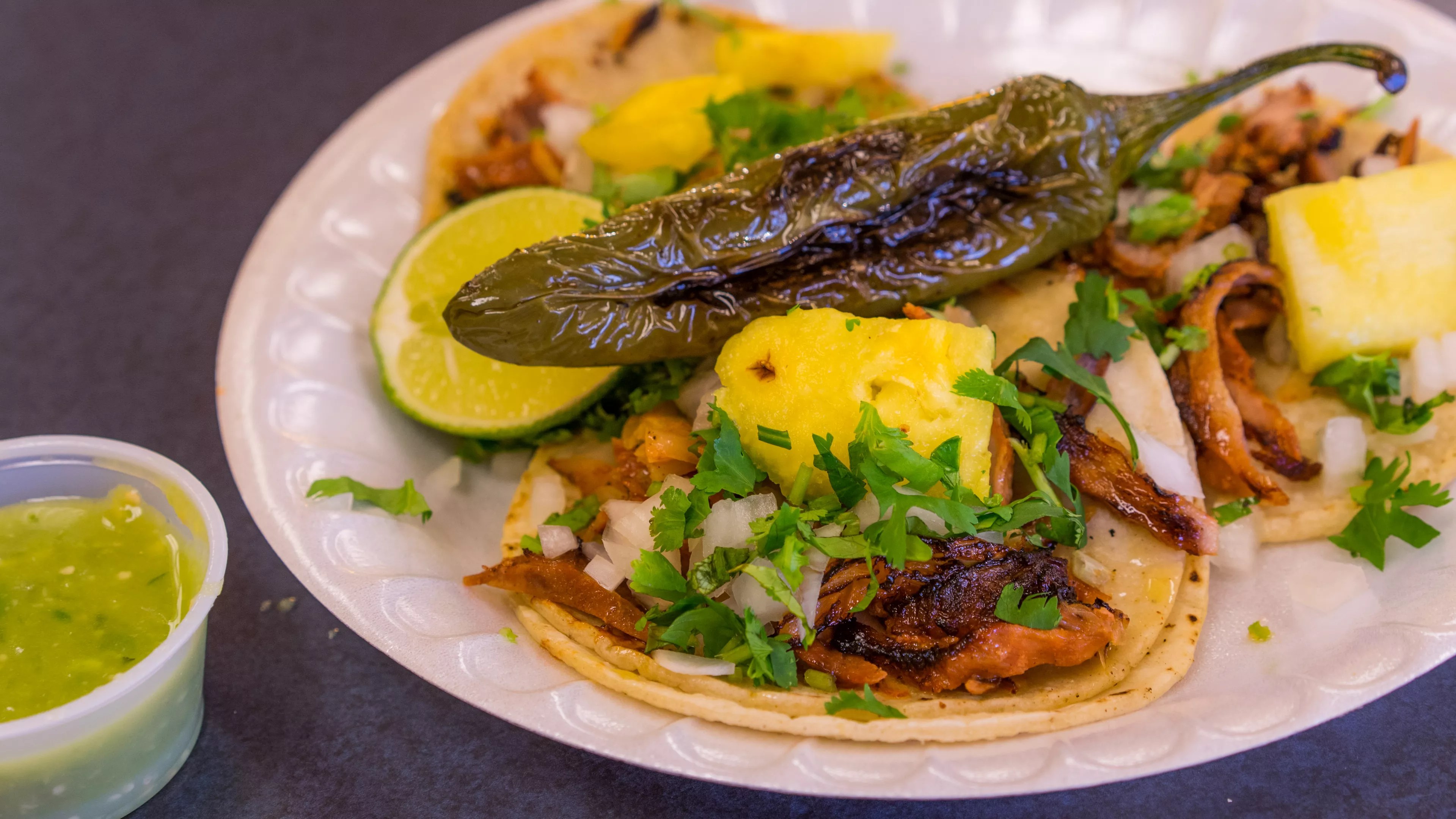 The al pastor is topped with slivers of pineapple and served with a side of a creamy green jalapeño sauce. Among some standard bottled soda options, the shop also offers Boing! brand juices in flavors like mango and guava, either of which make for a perfect foil to the spicy condiment.