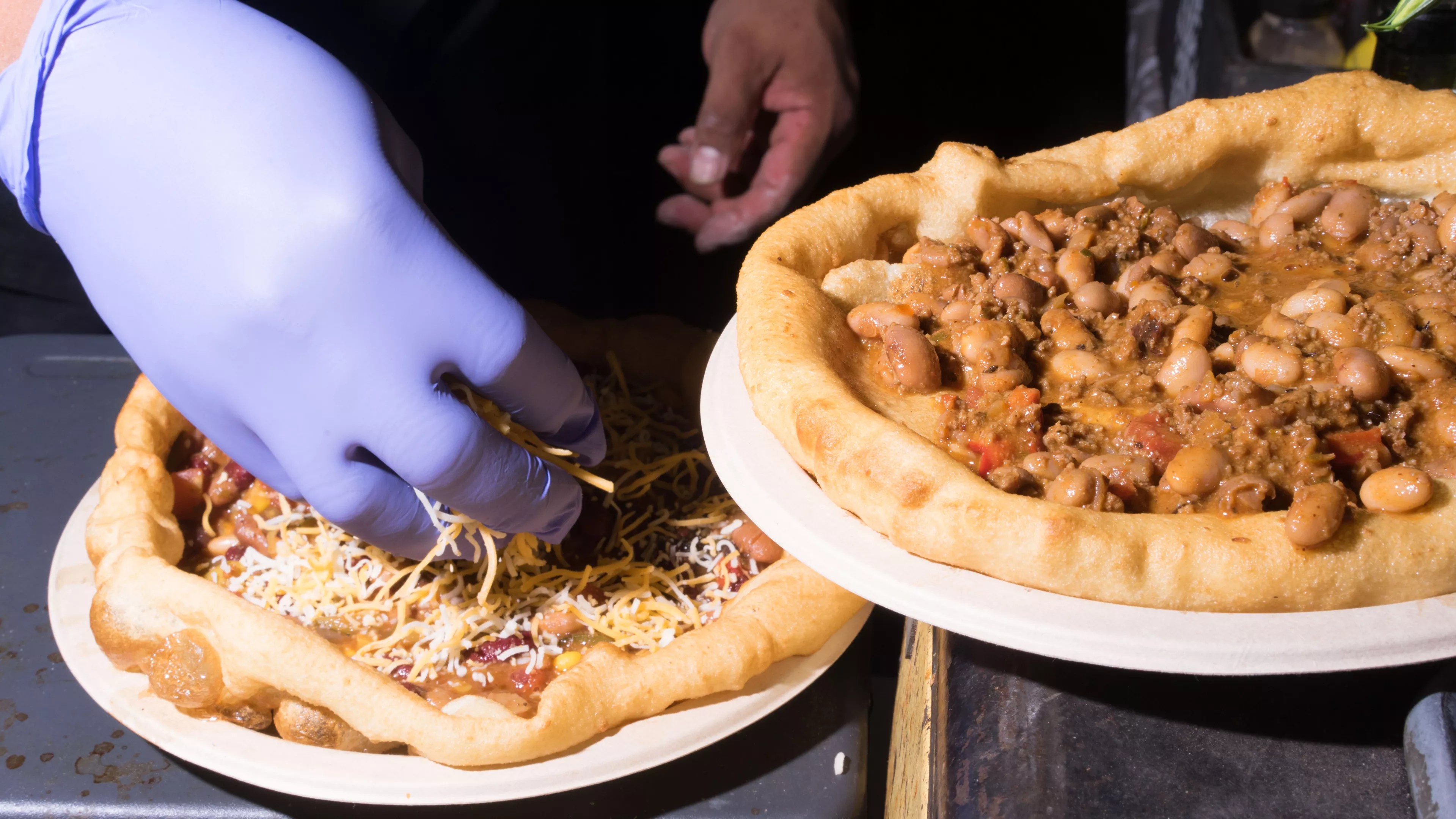 For a few hours, Etsitty makes Navajo-style fry bread in both sweet and savory options. Etsitty caramelizes sugar atop the sweet fried dough rounds, then serves them with the choice of honey, agave, powdered sugar, or other sugary toppings. But he’s best known for his two savory stew-topped Navajo tacos.