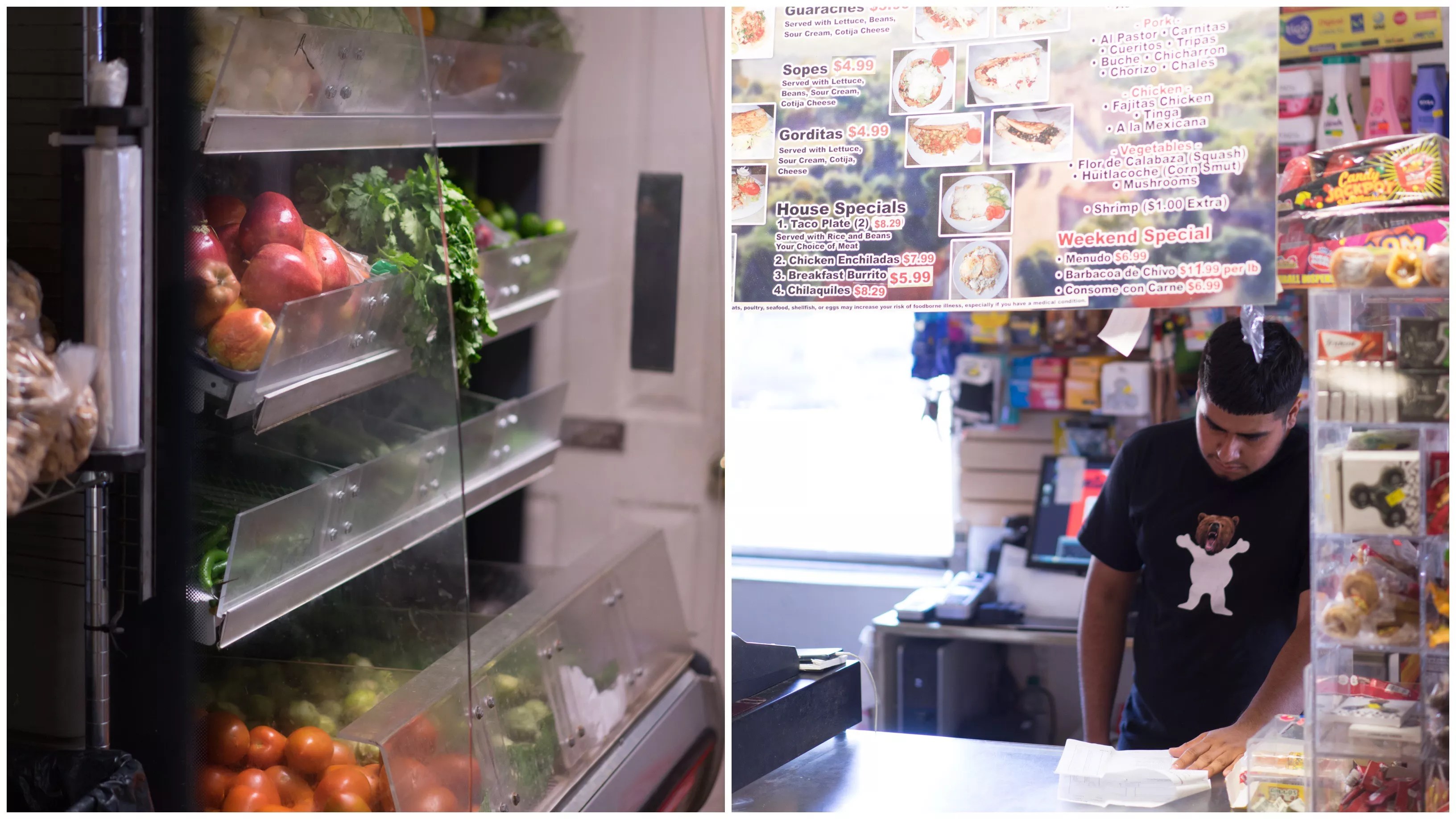 Left: The produce fridge at the market is stocked with tomatoes and tomatillos, among other staple produce. Right: The front counter is where all items are rang up and where prepared food orders are taken.