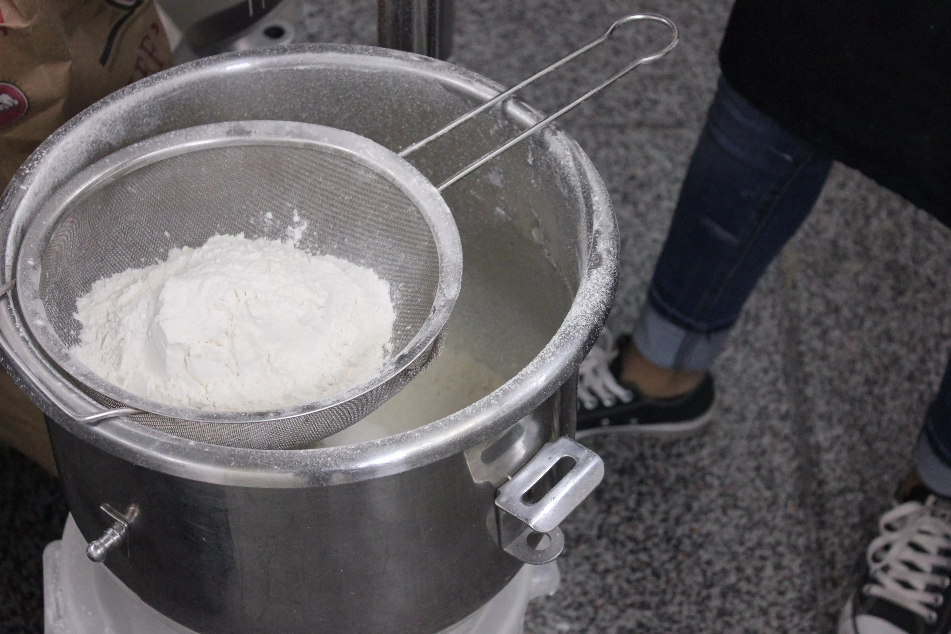 She dumps the flour blend, shortening, and salt into a stand mixer. The mixer hums. With a careful eye, she pours in warm water and evaporated milk. How much? It depends. Because she skips the usual standardized industrial flour for more variable local products, the amount of moisture needed to yield the ideal tortilla dough varies. Hernandez says it varies based on “how thirsty the flour is.”