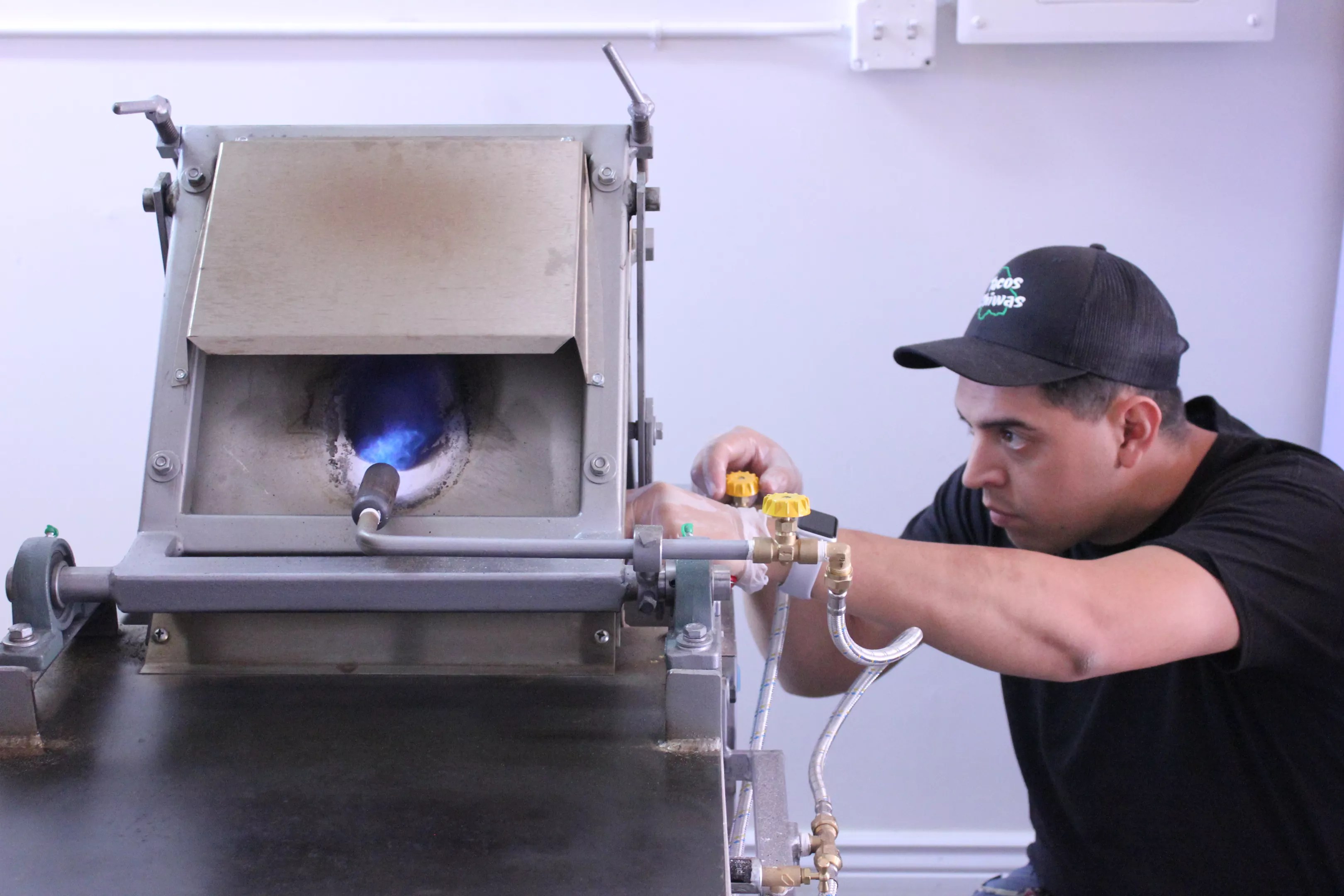 Firing up the device takes at least ten minutes. Hernandez flips on the gas, and crouching with a lighter ignites a series of flames as you would ignite a gas grill. This heats up the plancha-the treadmill-looking steel griddle at the base of the metal box the dough will go in. The blue flame ignites, projecting into the box. A sucking sound rips the air like a fighter jet.