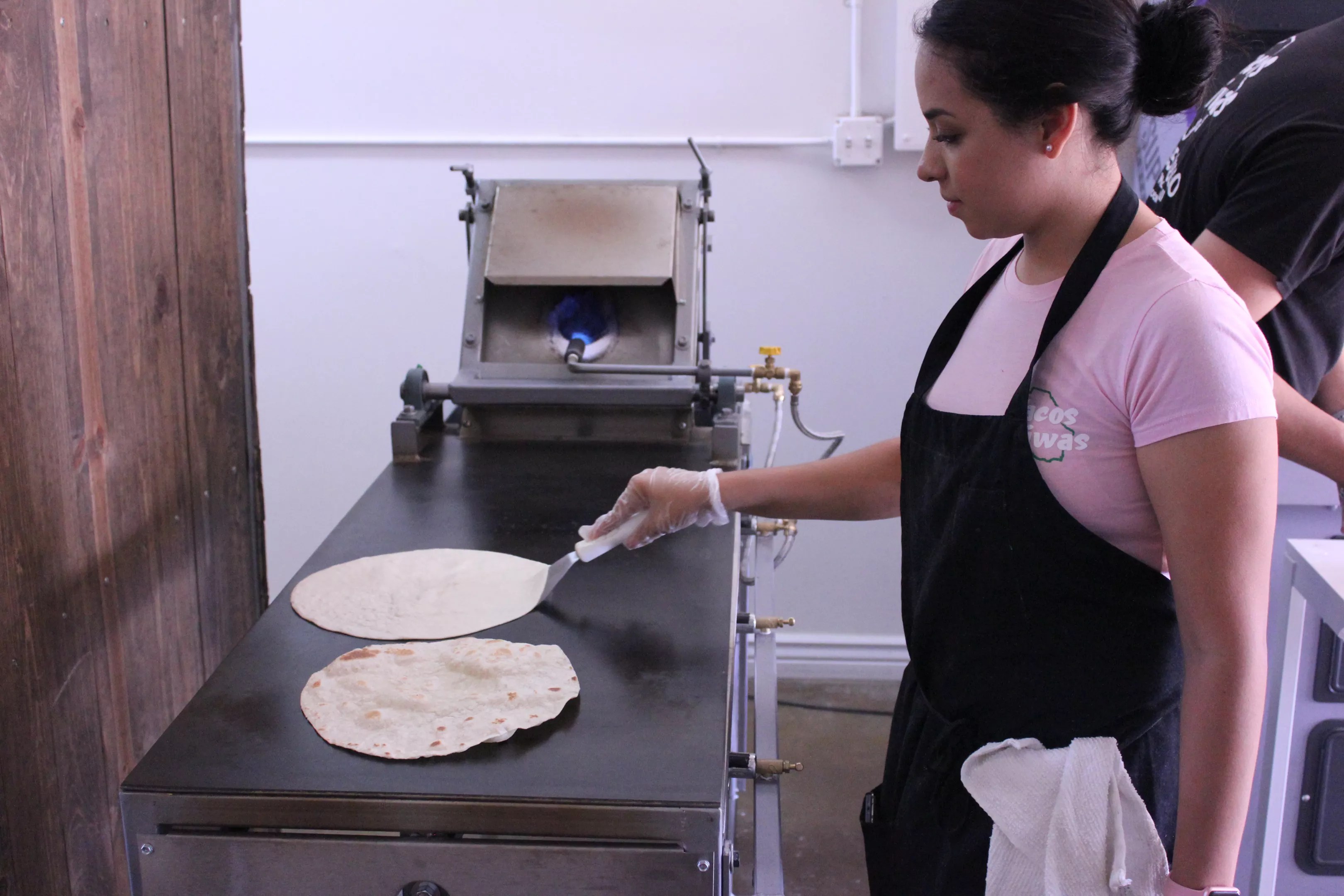 But Tacos Chiwas’ flour tortillas don’t begin with blue flame and aluminum. They begin with Holguin.