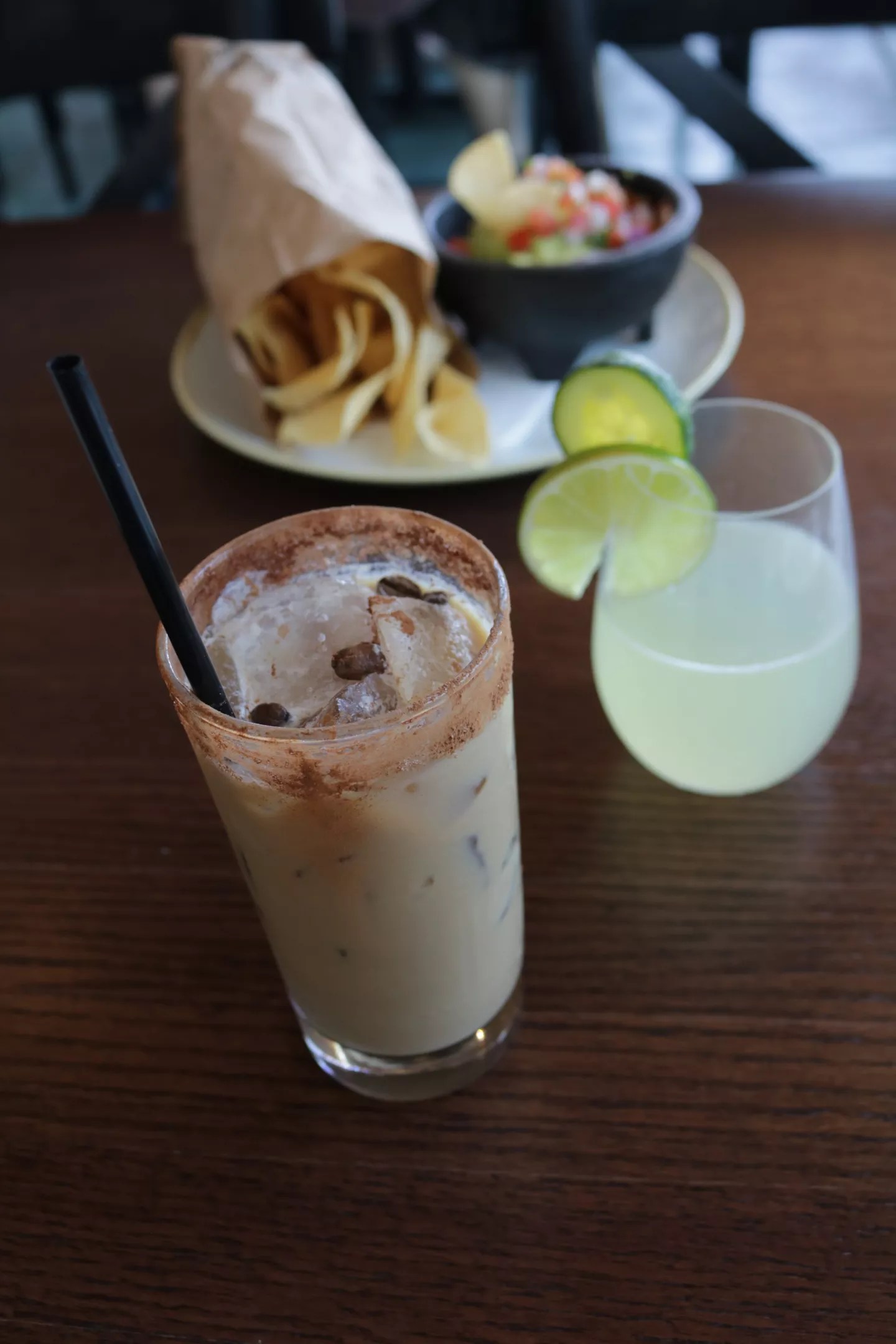 Our beverages arrived: the Cafe Hacienda, a combination of Patron Café, 1921 Tequila Cream, and cold-press coffee, with a Mexican cocoa & spiced vanilla rim ($9), and the Mexico ’70, featuring Sauza Cucumber Chili tequila, agave, lime, and sparkling wine ($9).