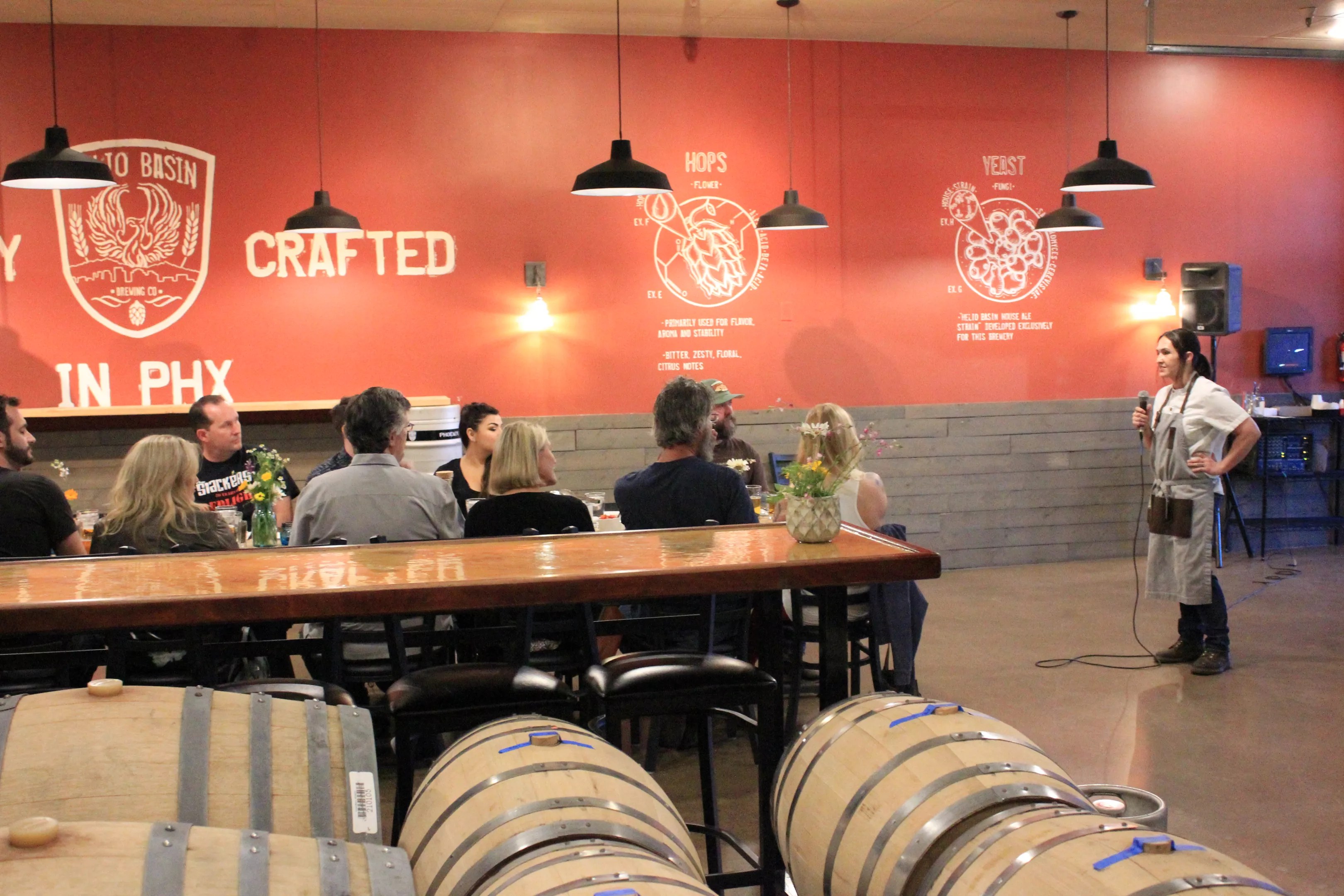 Desert flowers line a burlap runner down the center of a long table. More than two dozen diners crowd the table, their chatter thick, their camera phones at the ready, their pale ales and hoppy ambers sinking lower into their glasses with each sip. A sudden hush spreads. A new course is coming. Tamara Stanger, chef at Helio Basin Brewing Company, takes the microphone at the table’s head.