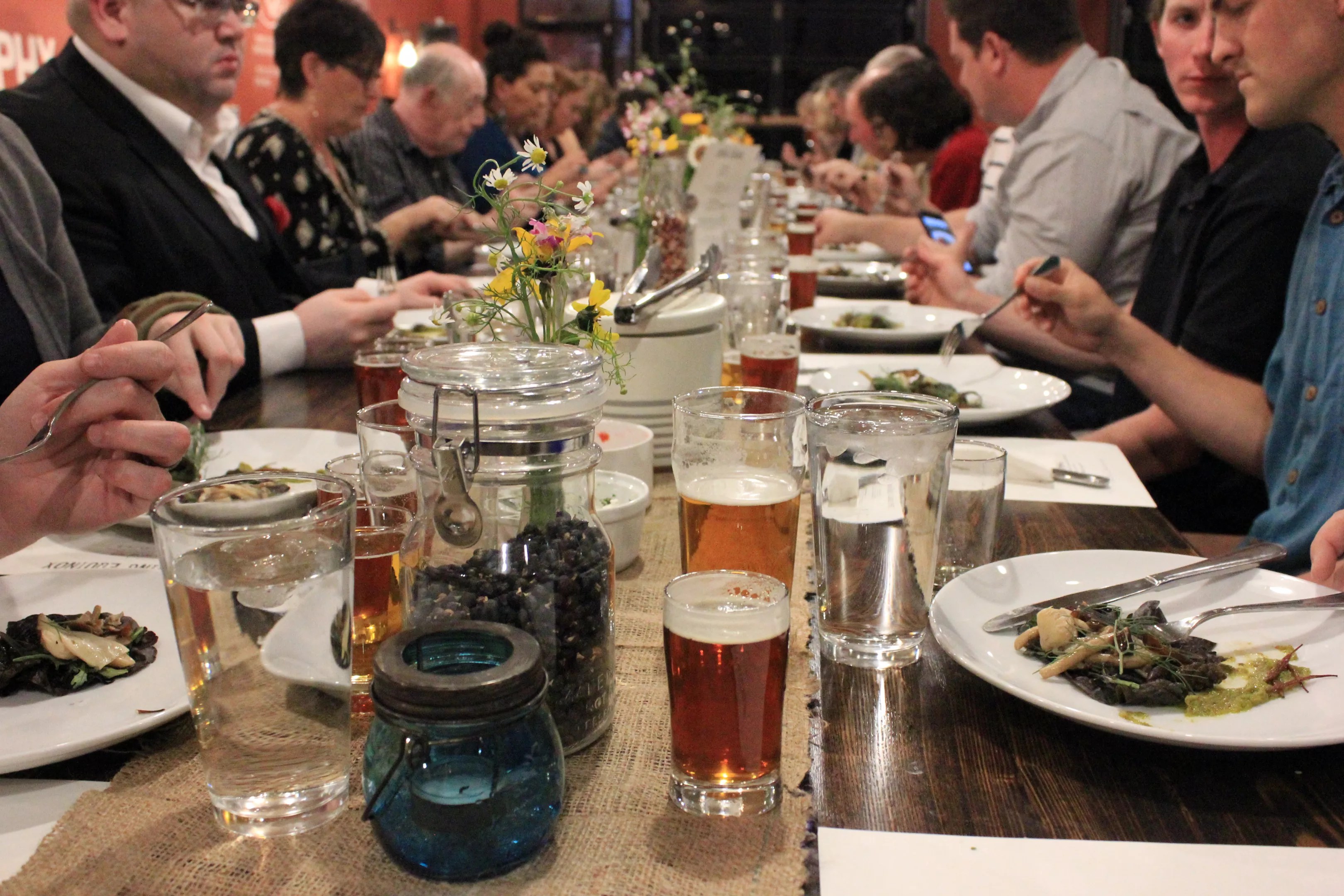 As the fourth dish goes out, Hazer, head brewer, takes the mic. He talks about the dinner’s fourth beer: a porter. Hazer and Stanger have paired a Helio Basin beer with each course.