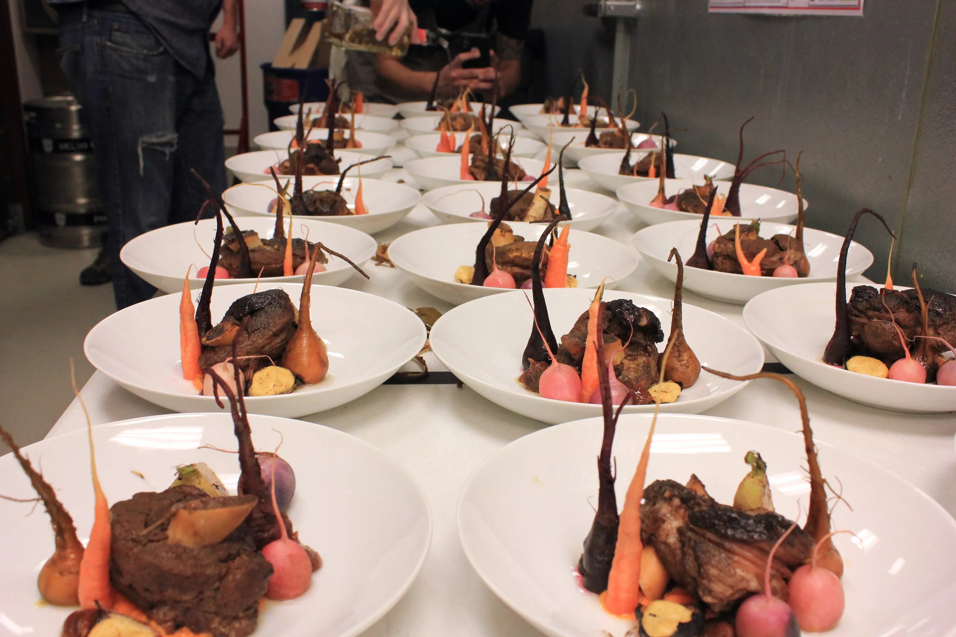 Dish five is goat osso bucco flambéed with tequila. There is apricot butter and a ring of vegetables around the darkly roasted shank: purple radishes, carrots, charred onion petals stuffed with gouda, turnips with a hard sear, a rainbow of purple and pink colors. Some have been smoked over hickory.