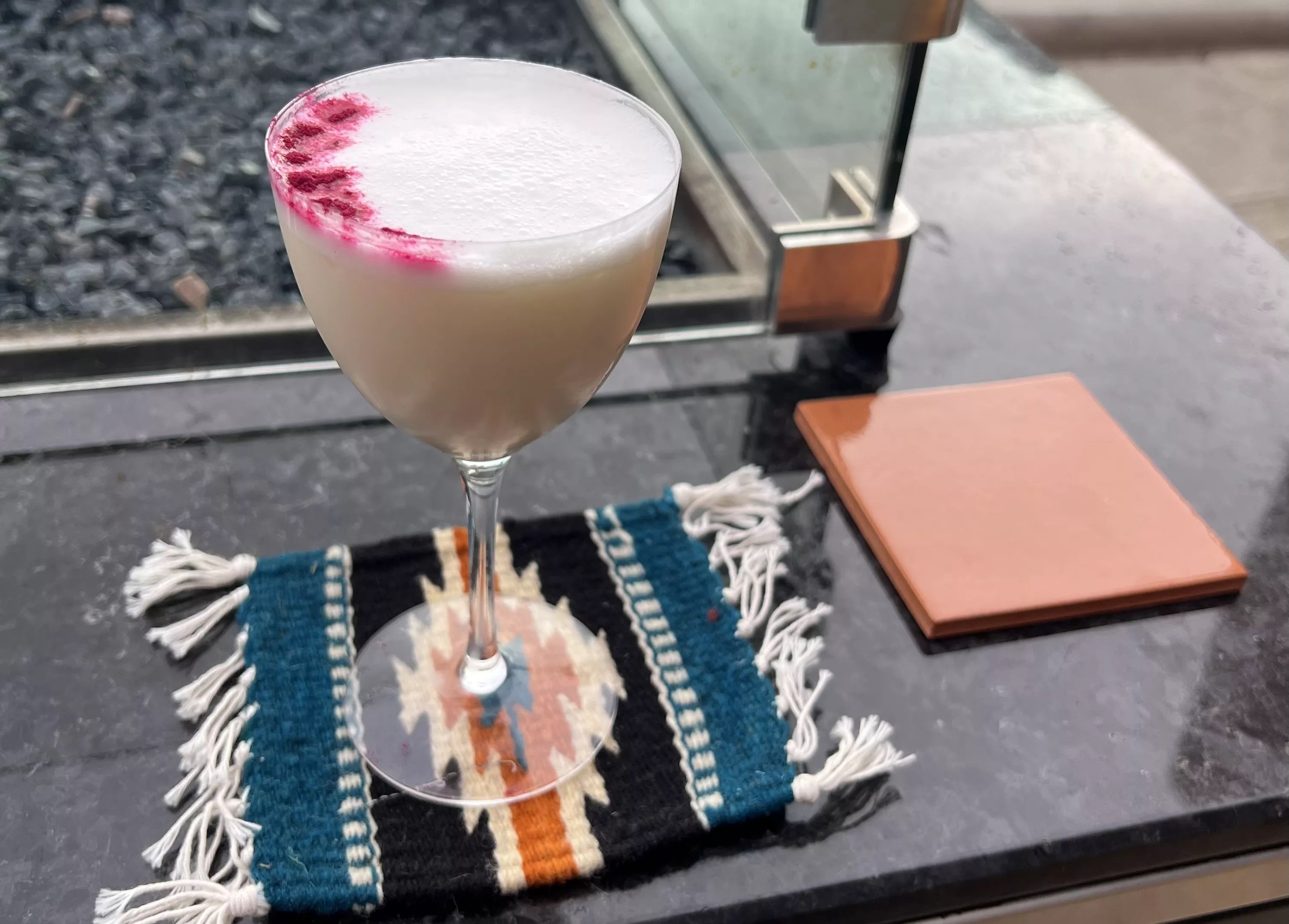 The eponymous Heart of the Dessert is a lovely and light libation utilizing The Lost Explorer espadin, with just a hint of sweetness from honey. A lavender cream on top manages to avoid being too floral, and a purple highlight on the cream is an attractive touch.