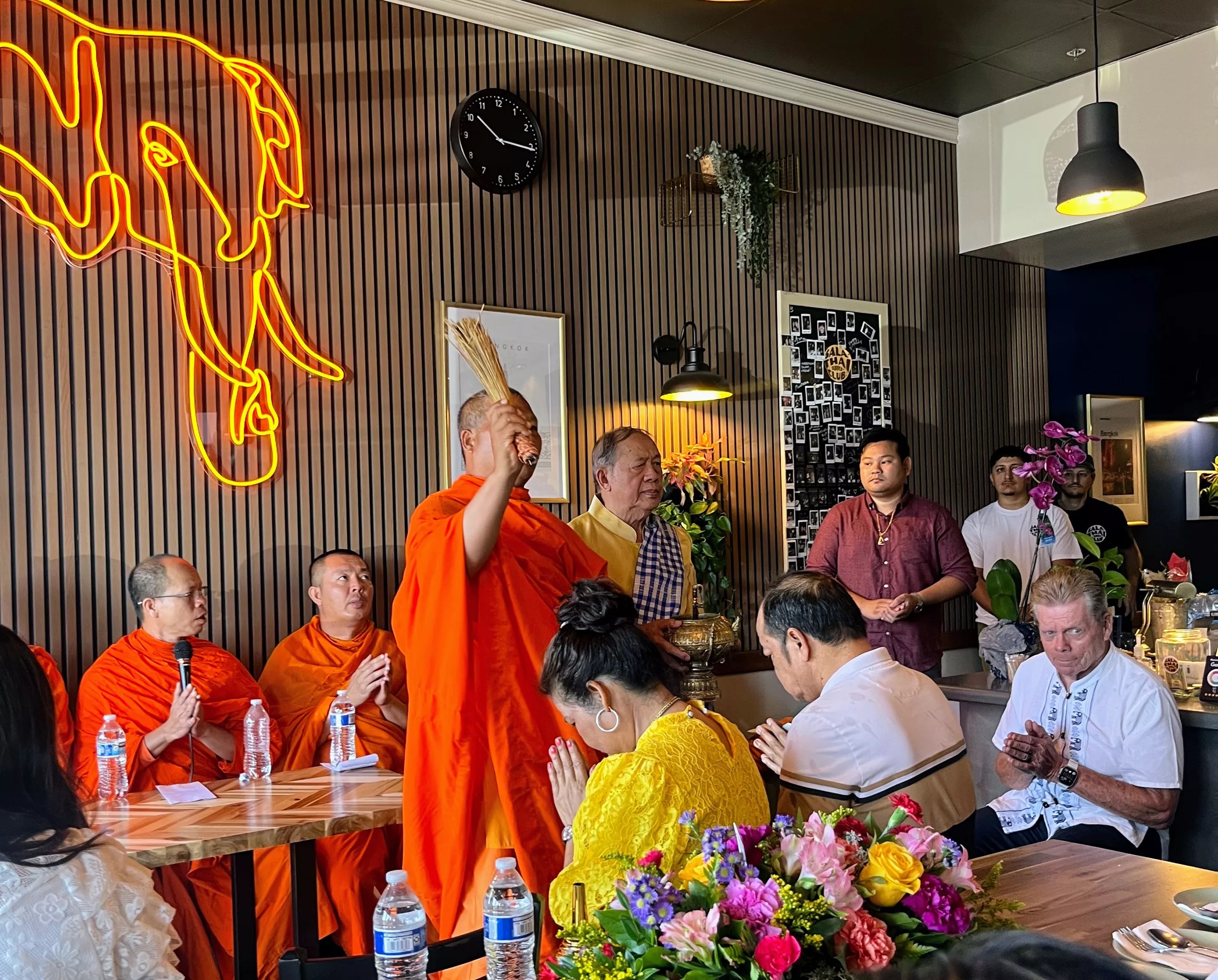 Amid the soft hum of chants, seven Thai monks in vibrant orange robes blessed the restaurant with prayers and holy water. In a gesture of gratitude, Pluemjit presented the monks with an alms donation.