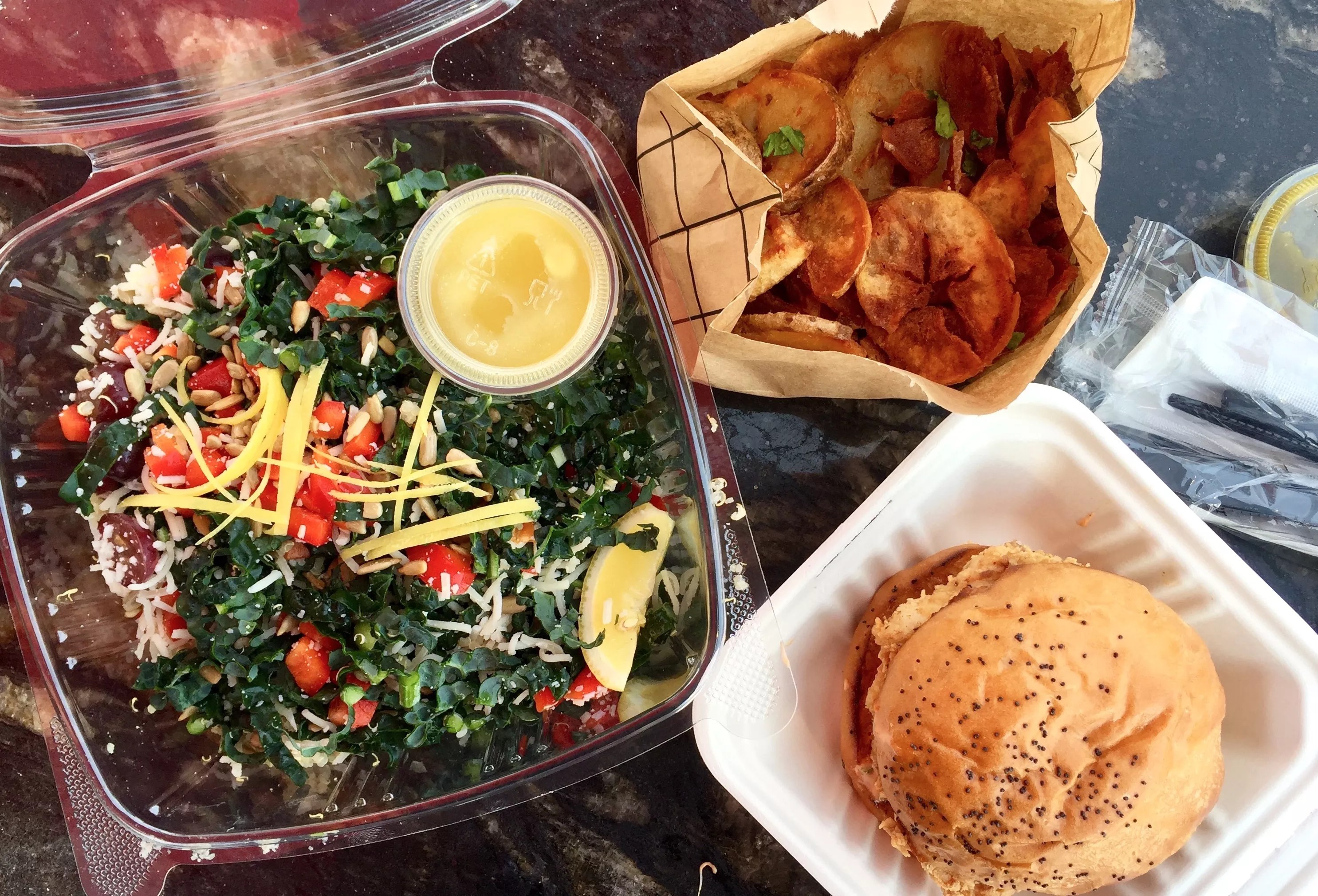 Most of Ingo’s menu is meant to be eaten with your hands. Finger-fight over the Shattered Potato Chips, a basket of deep-fried tater slices that come with a thicker-than-yogurt cream dip and homemade green spicy sauce (double dip for best results). Or dive into their Crispy Chicken Sammy, an impossibly crispy breast layered with spicy aioli, apple slices, and pickles on perhaps the spongiest burger bun ever made. Ingo’s also has grass-fed beef burgers, Toni’s Deviled Eggs, and fork-required salads. Curbside is a well-oiled machine here, food comes fast and expertly packed, and every order has those legendary mini French sea salt chocolate chip cookies.