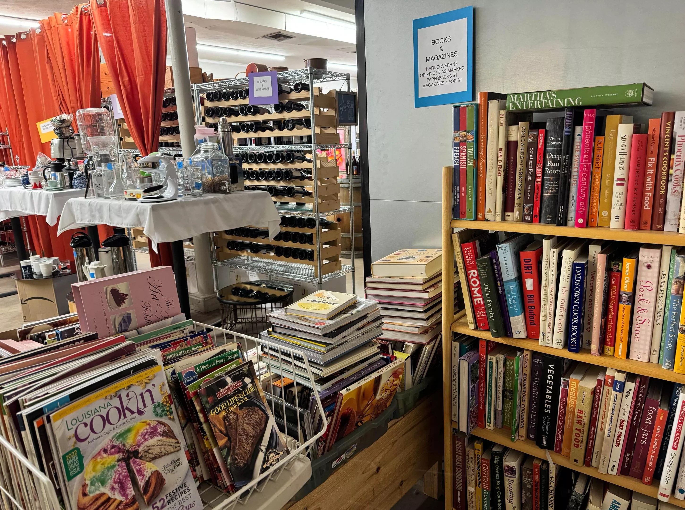 Organized on tables are vignettes of offerings. Mugs are grouped with French presses and a Cuisinart coffee maker. A black-glazed tagine sits next to steam baskets, which are tucked beside a fondue pot. Enameled pans are displayed, still in their original boxes. A sous vide cooker is placed alongside an Instant Pot, an air fryer and a meat-grinding attachment for a KitchenAid Stand Mixer. Heart- and lobster-shaped baking pans are stacked on a table next to boxes of brand-new Silpat baking mats and canisters brimming with wooden cooking utensils. A book nook features classic culinary reads such as “The Joy of Cooking” and “The Cake Bible,” as well as titles from Ina Garten, Martha Stewart and Milk Bar baker Christina Tosi.