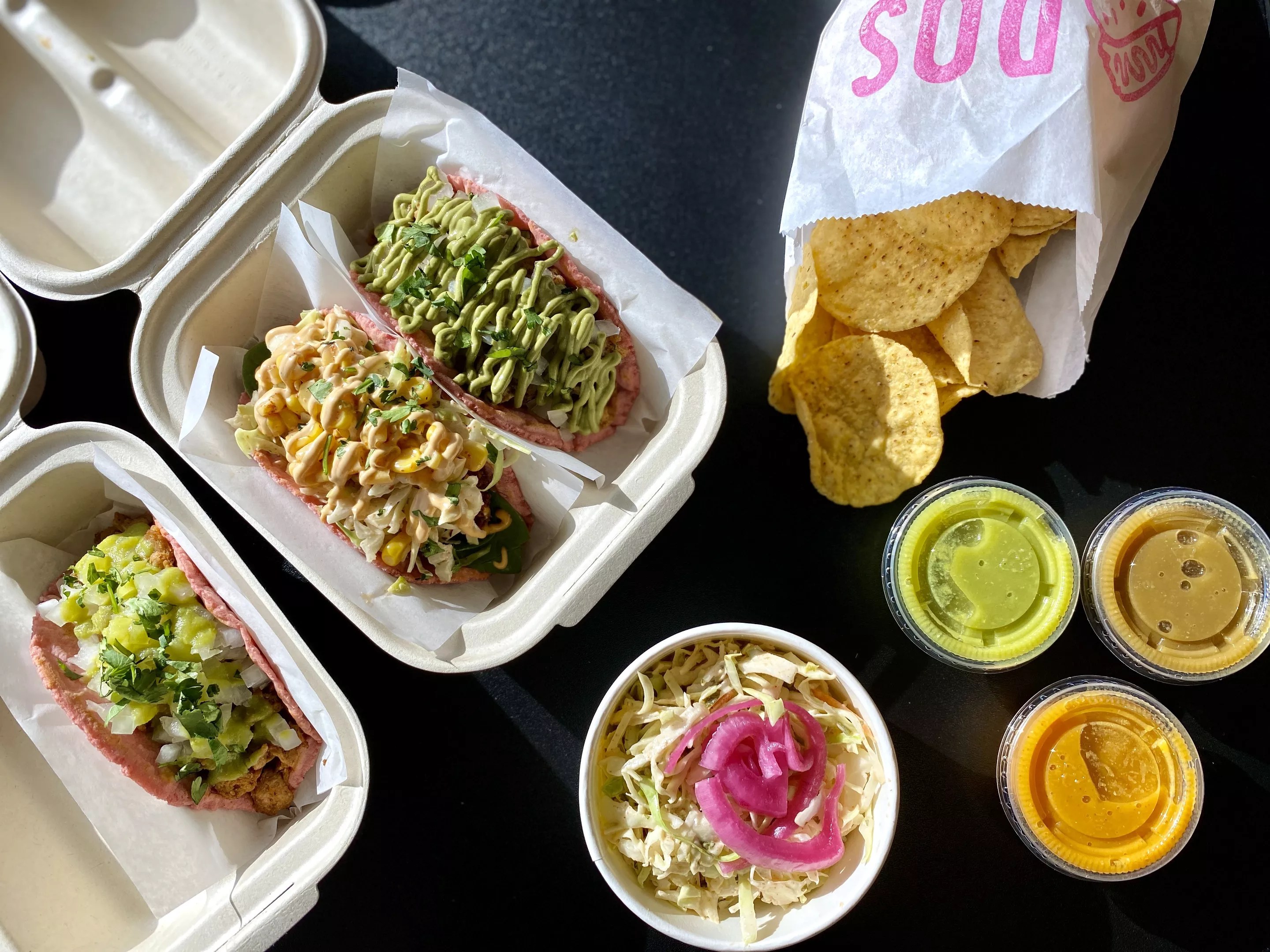 Dos Pink Tacos serves vegan sauces, tacos, and slaw made from scratch.