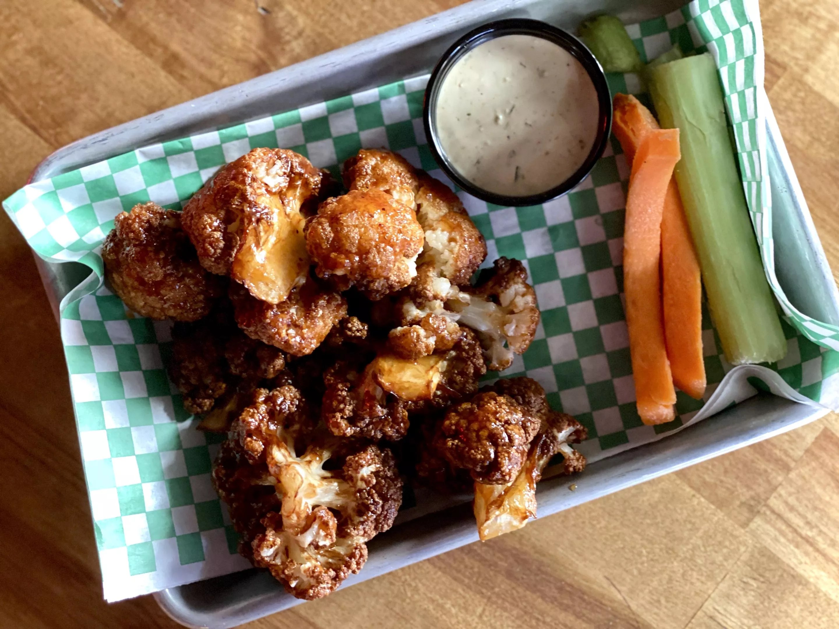 Multiple locations Shout out to local brewery Pedal Haus for their designated vegan menu. The Bavarian pretzel, loaded nachos and mac and cheese medley also includes vegan cauliflower “wings.” In other words, vegans aren’t an afterthought. The only wings on the list that don’t come with breading, what they lack in flour, they make up for in flavor. The deep fry adds a burnished edge giving them a wing look, before they’re tossed in house-made sauce (vegan Buffalo, chipotle barbecue, whiskey barbecue or Carolina barbecue) to thoroughly coat the florets. They come with an ample side of creamy vegan ranch and a knife and fork which you may need. Vegan & Vine’s Buffalo Cauliflower doesn’t skimp on size. Allison Young
