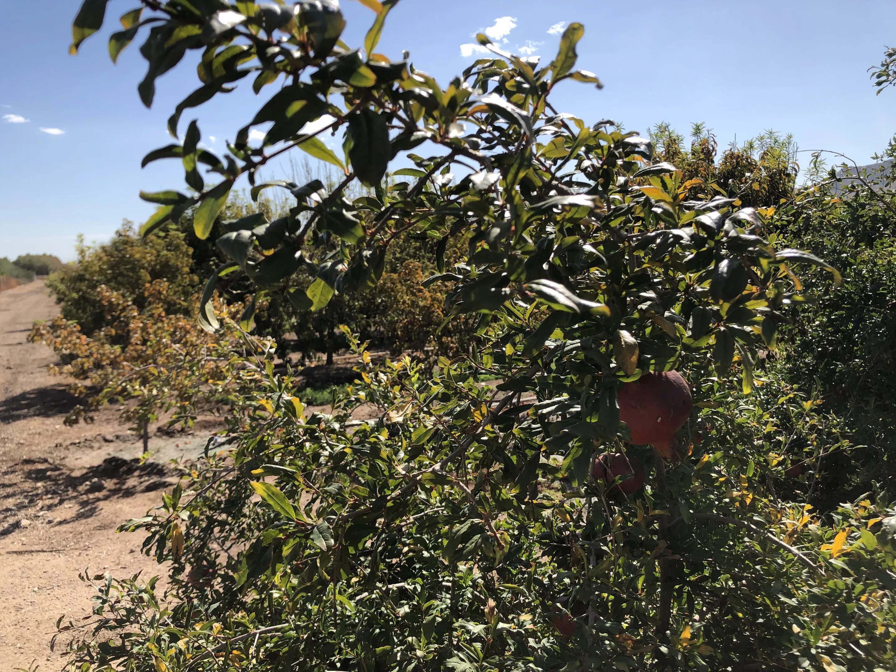 Pomegranates hang, ripe with juice. Birds pick at fallen fruit between the trees, dart from lane to lane, perch, look. The peach trees, harvested in late spring, yellow in the hot early fall sun. The lemons are bagged and ready at the farm stand closer to the country road, where you pay by the honor system. Sun oozes. South Mountain looms near but far. And heritage chickens squawk, shrilling the fronds of the date trees.