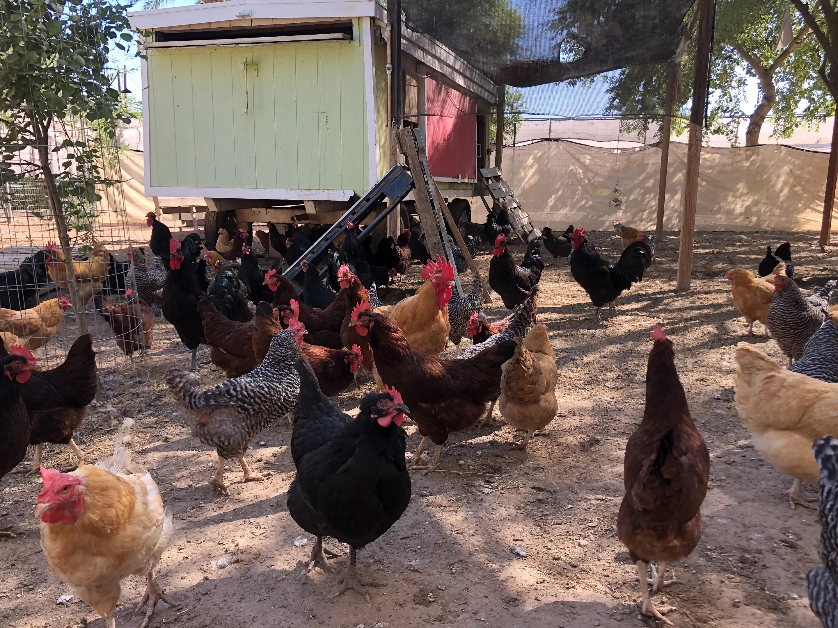 The piercing chicken calls and sun pulsing your skin pull you, walking the farm, again and again back to the present – to the adobe house and the date palms, the pickled eggs and chain-link patterns on plump heritage chickens, to the camping tents leaking twangy music.