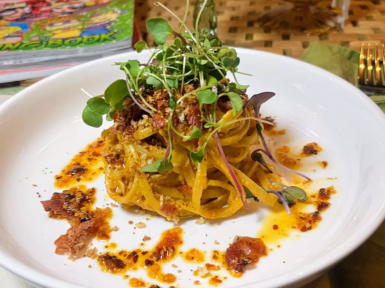 One of Waldman’s go-to comfort dishes is her pumpkin chili crisp pasta with prosciutto panko crumble and Pecorino Romano cheese.