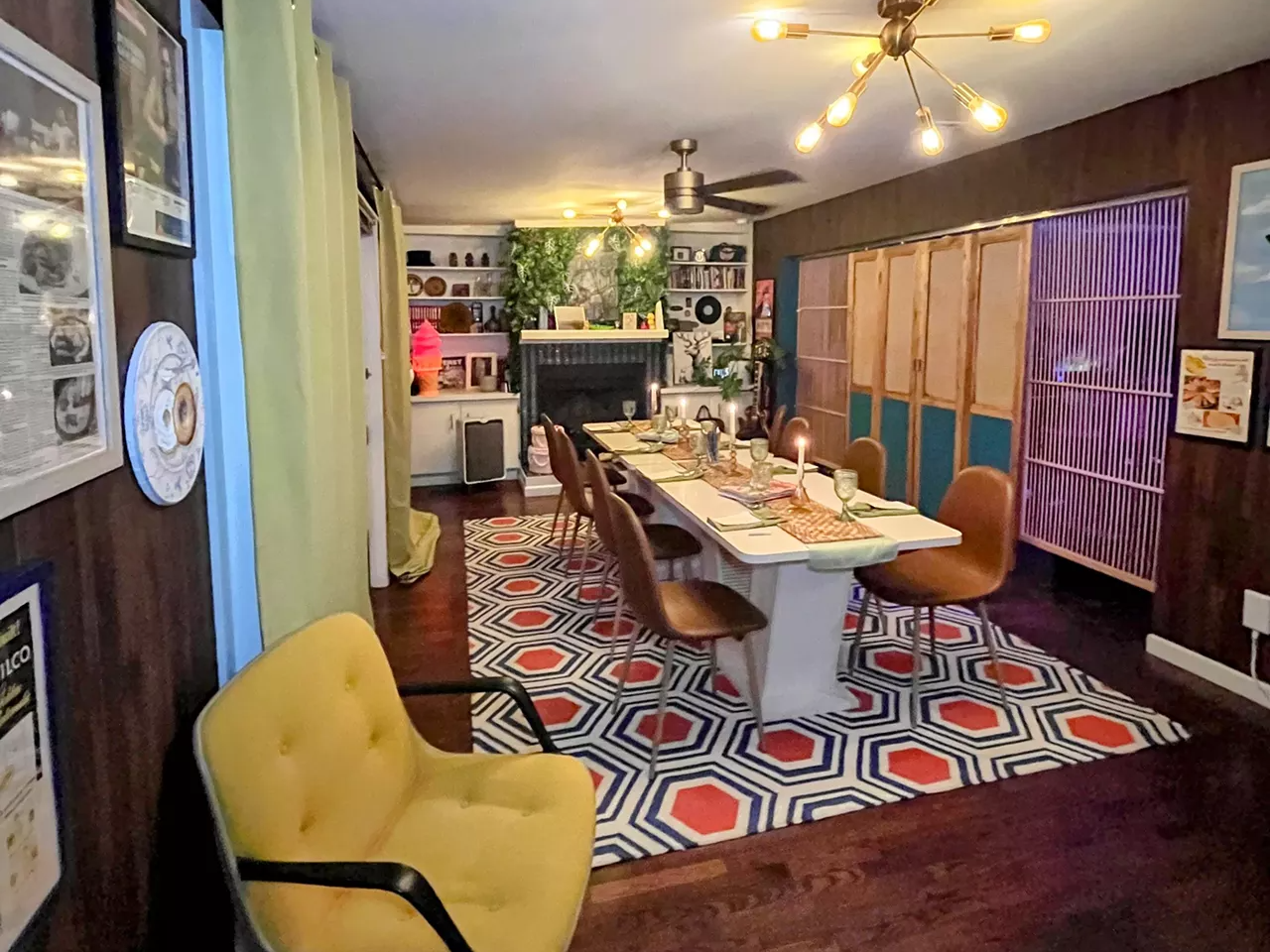 Sliding open the glass door and stepping inside, Waldman shows us the mid-century-inspired dining room packed with kitschy collectibles. An eight-seat dinner table is topped with more candles. A wooden puzzle-like runner spans the table’s length, flanked and topped with plates, silverware and large wine goblets. There are also coloring books and crayons.