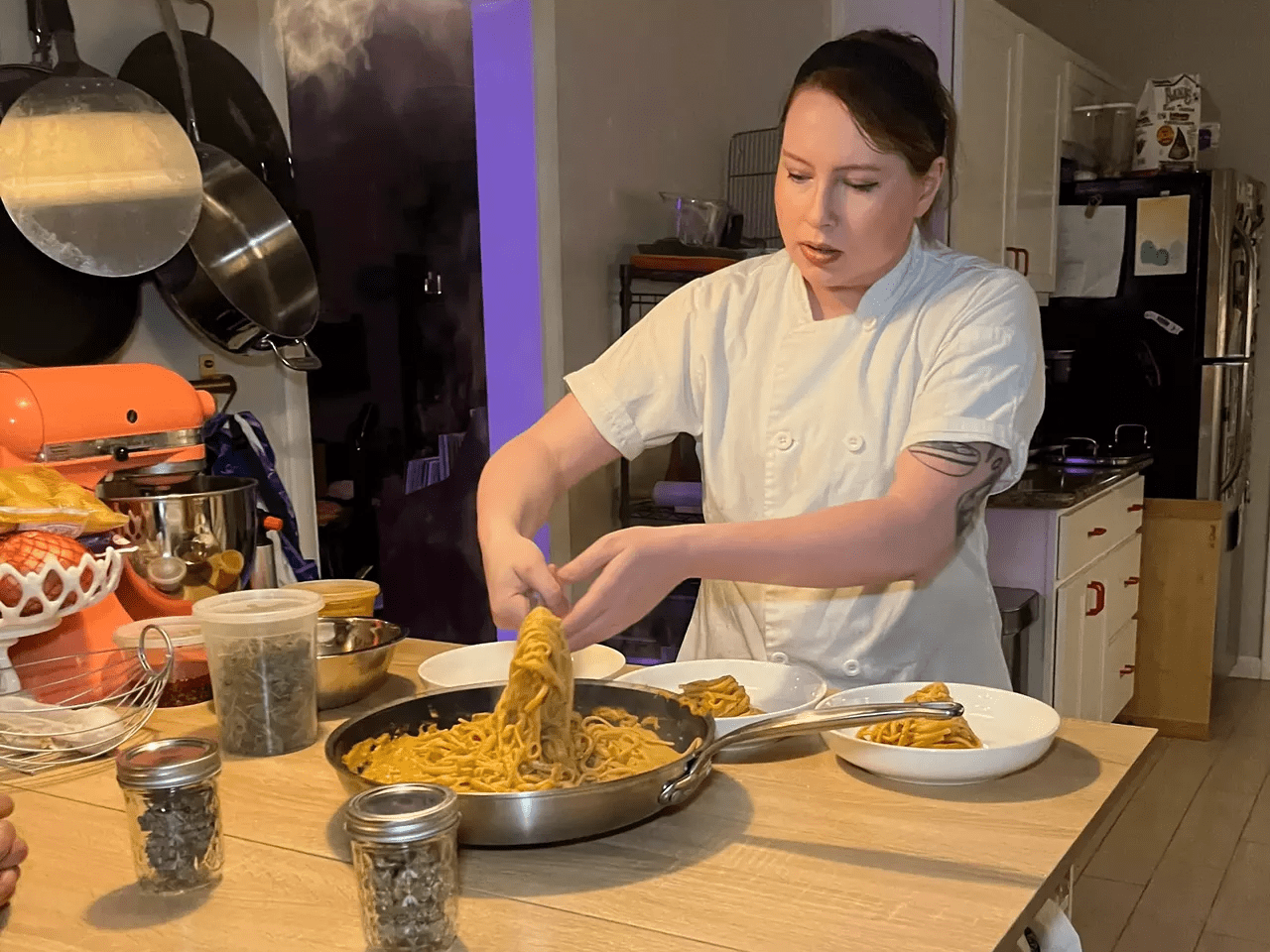 During our interview, Waldman prepared one of her go-to comfort dishes and the third course of her April dinner menu: pumpkin chili crisp pasta with prosciutto panko crumble and Pecorino Romano cheese.