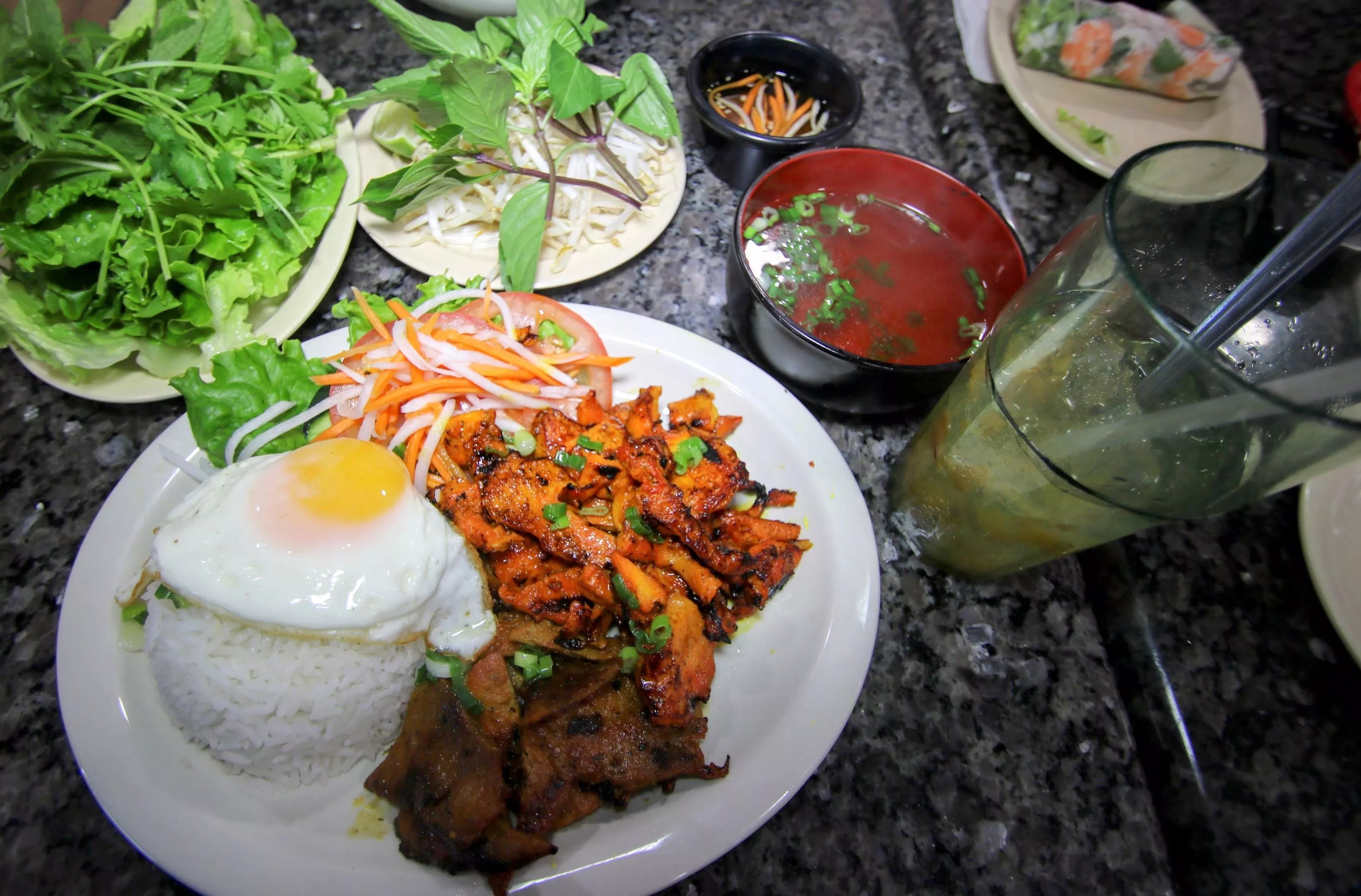 “We have the traditional rice dishes,” Nguyen adds. “You have the grilled pork plate, Com Thit Nuong, and I added grilled chicken with fried egg on top of the rice.”