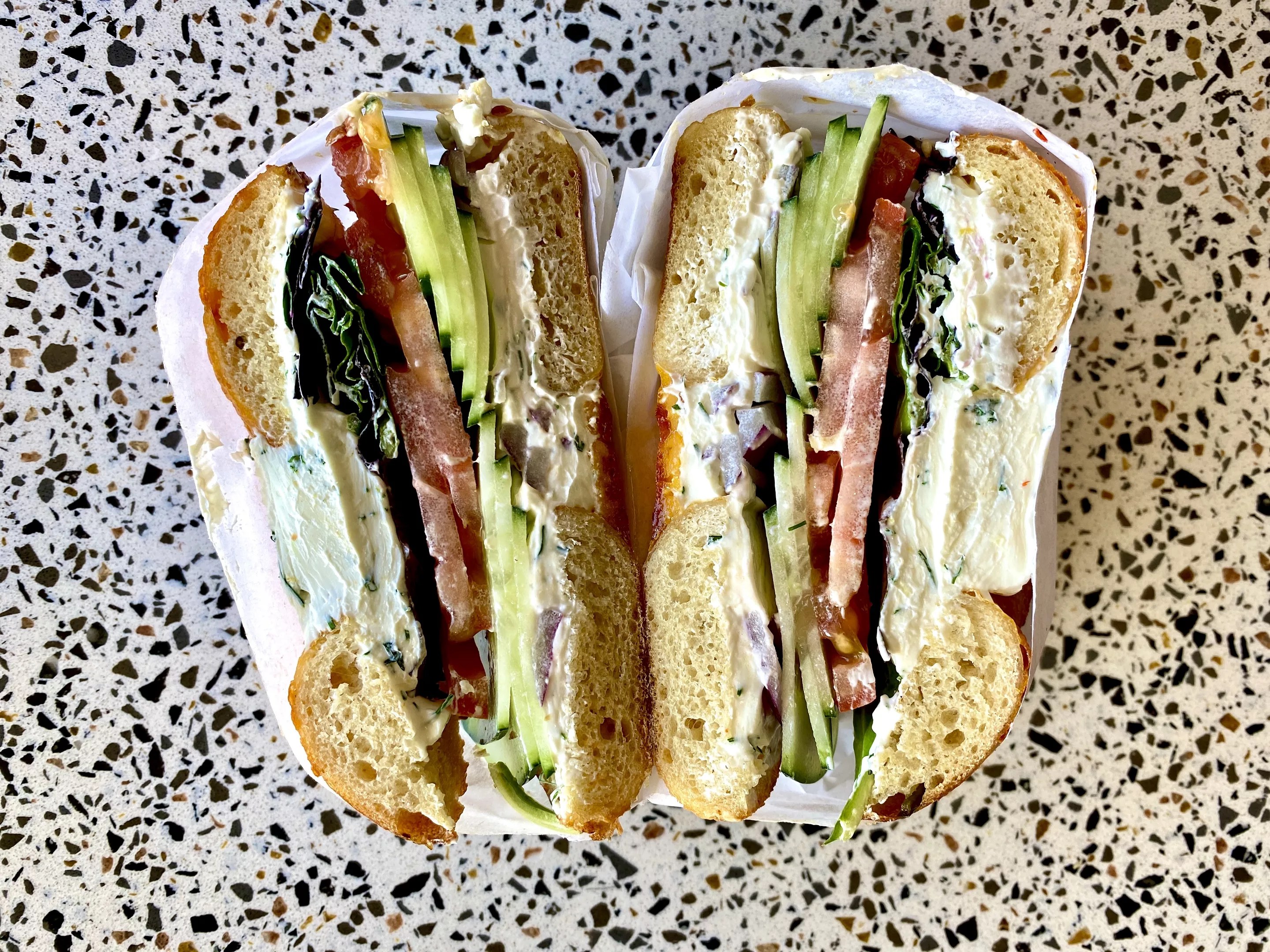 Step inside and Fregozo will walk you through the menu, a five-sandwich-strong hit list of sweet and savory options including sliced strawberries and Nutella or a lox sandwich with lemon- and dill-spiked cream cheese. Bonus points if you get the music references. The CV sandwich comes layered with sliced cucumber, tomato, and garlic and herb schmear painted on so thick it pushes out the middle. A local green, in this case, sunflower greens grown three miles away, round out the sandwich for a deliciously simple veggie option that gets extra points for freshness and vibrancy.