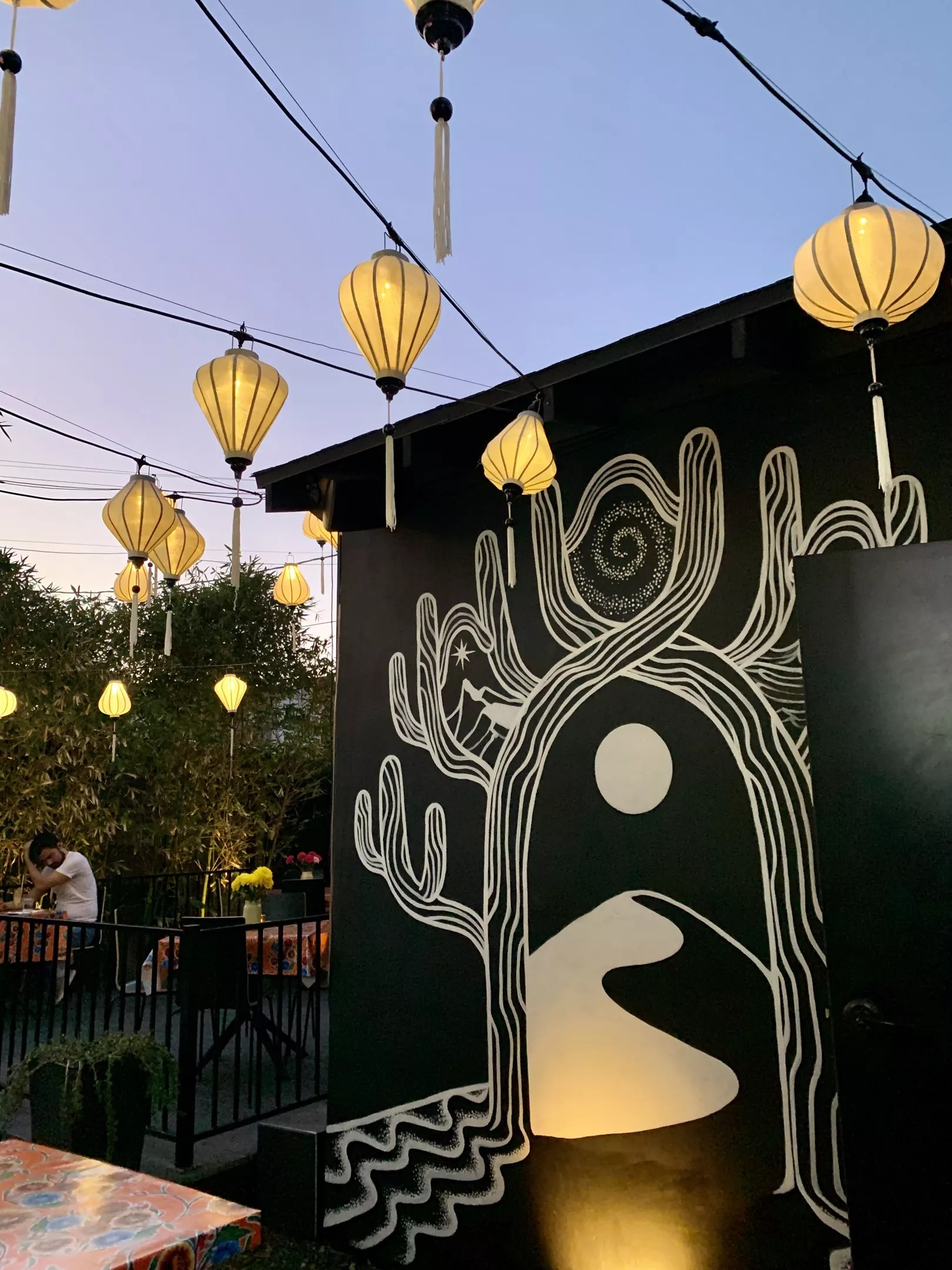 Fabric lanterns hang on strings crisscrossing the large patio seating area. Black-painted walls sport bright white murals depicting a tiger and a mystical vortex. Almost neon-colored floral tablecloths drape the seating areas and music pumps over the space.