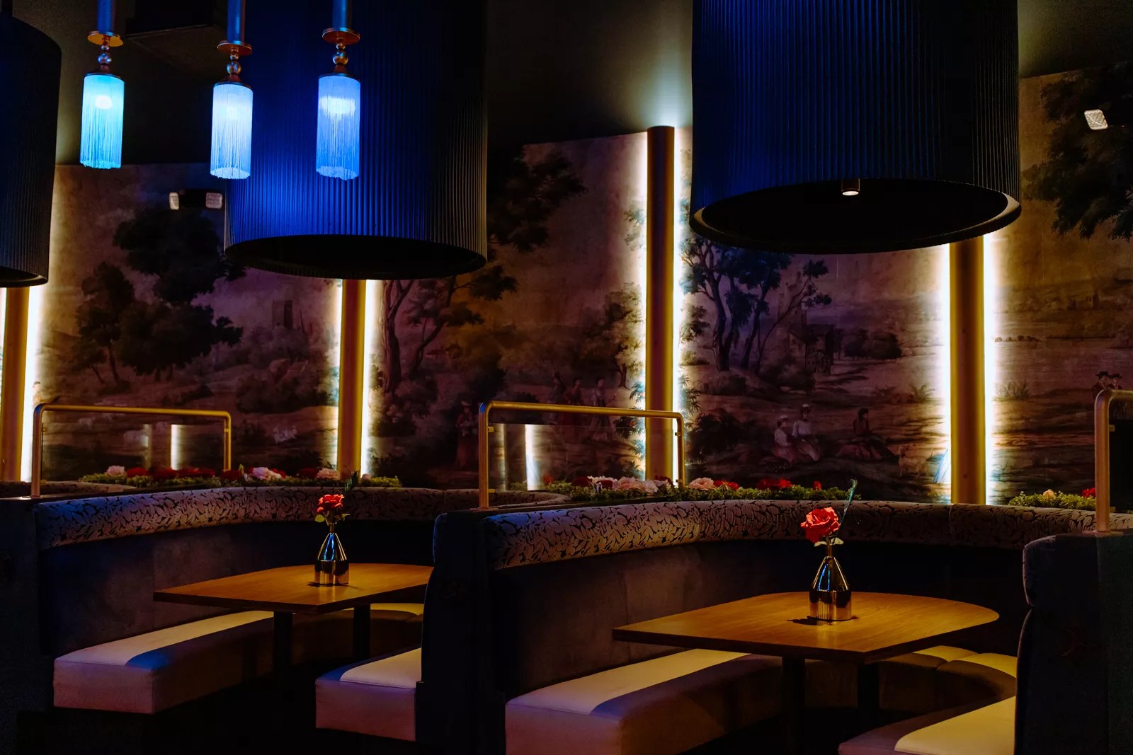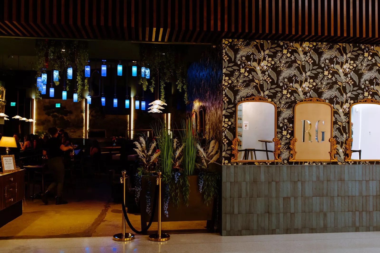 Inside, the intimate space flourishes with lush greenery, florals, and soft lights in hues of blue and green, creating the tranquility often found in a garden, and a welcoming change to the harsh city just outside.