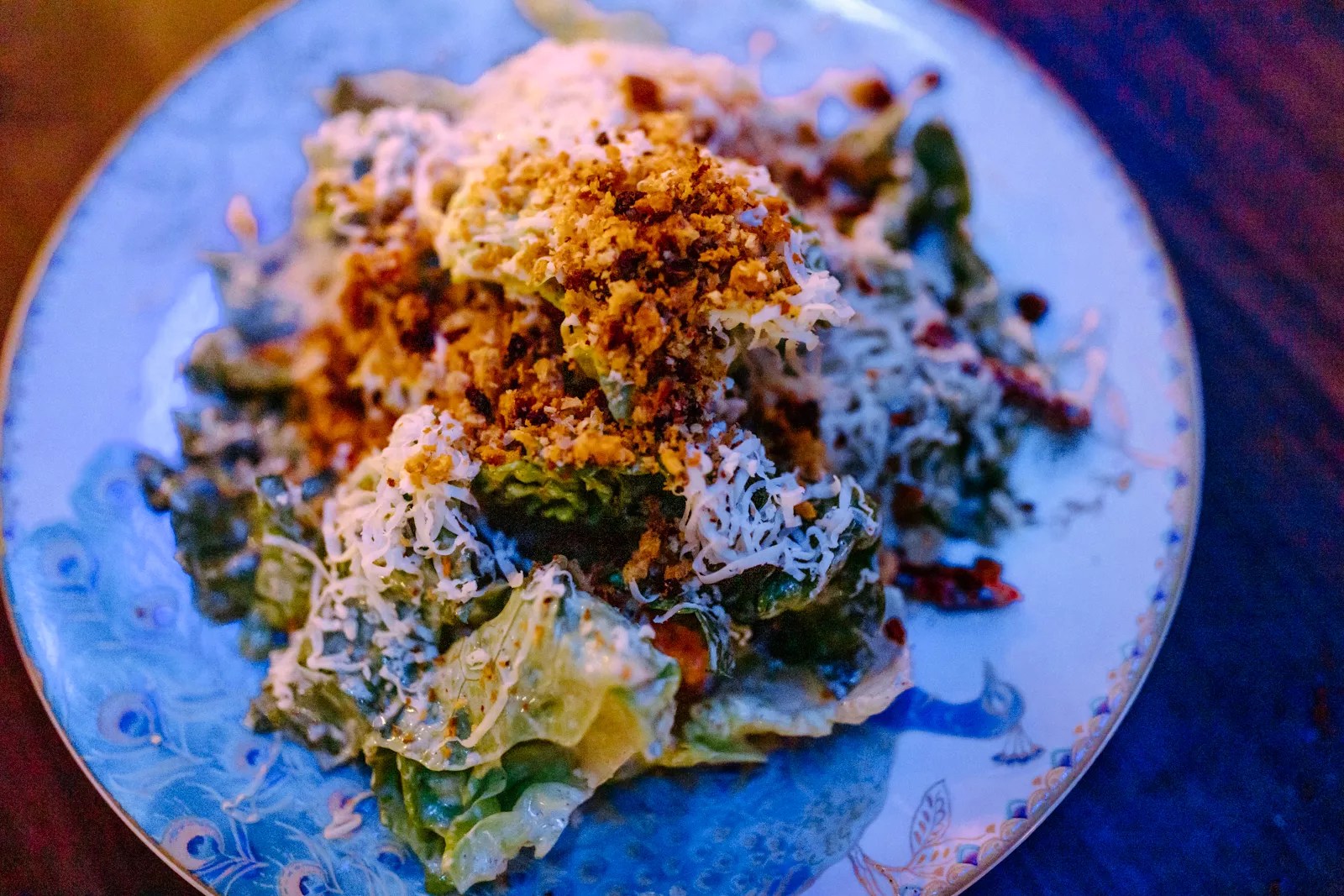 The Little Gem Caesar Salad is topped with aged Manchego cheese, dried tomatoes, and toasted bread crumbs.
