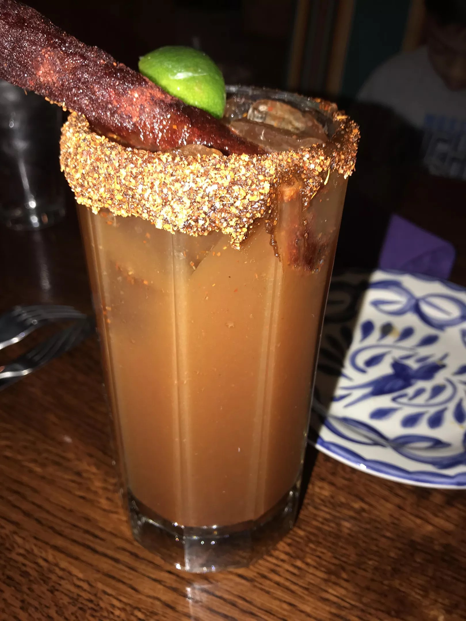 The drink starts with ice-cold Modelo Especial. Then, bartenders add a punch of spicy house-made Vampiro mix. Next, a glass is drizzled with tamarindo paste, and Tajín, a powdered mixture of peppers, lime, and salt, is sprinkled on top. Finally, a menacing-looking tamarindo candy stick, doubling as a sweet and tart drinking straw, is propped up on top of the glass next to a lime wedge.