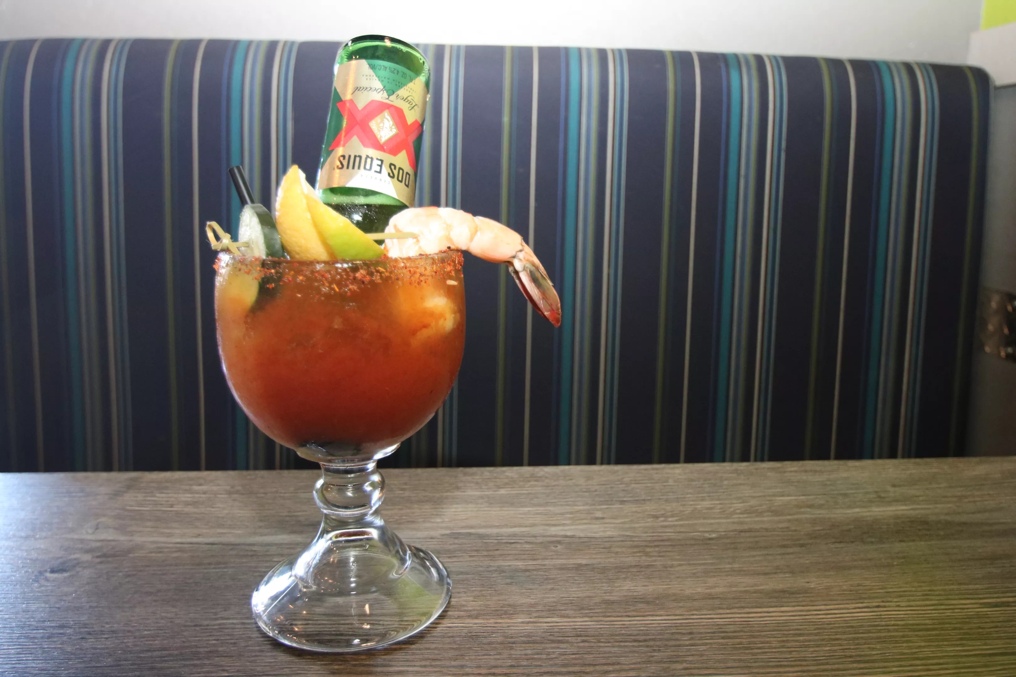 Aesthetically, the drink is over the top. The goblet-style glass is topped with a massive shrimp, a propped upside-down beer bottle, and a garnish of cucumber, jalapeño, and lemon and lime wedges floating in the middle.