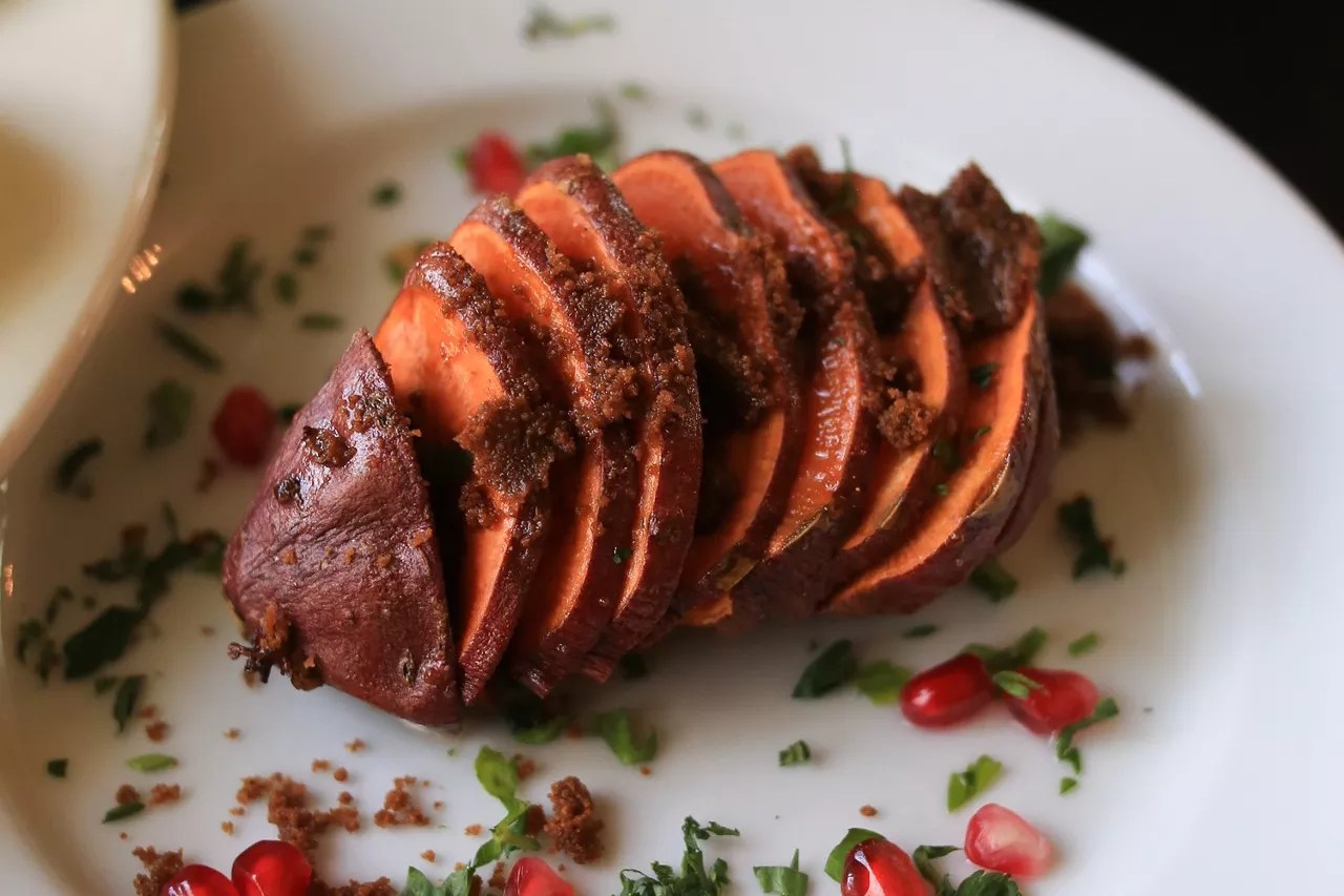 Hasselback sweet potatoes with cinnamon maple glaze are among The Giving Tree Cafe’s Thanksgiving vegan dishes.