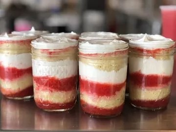 Multi-layered strawberry shortcake in a Mason jar by FernDiggidy.
