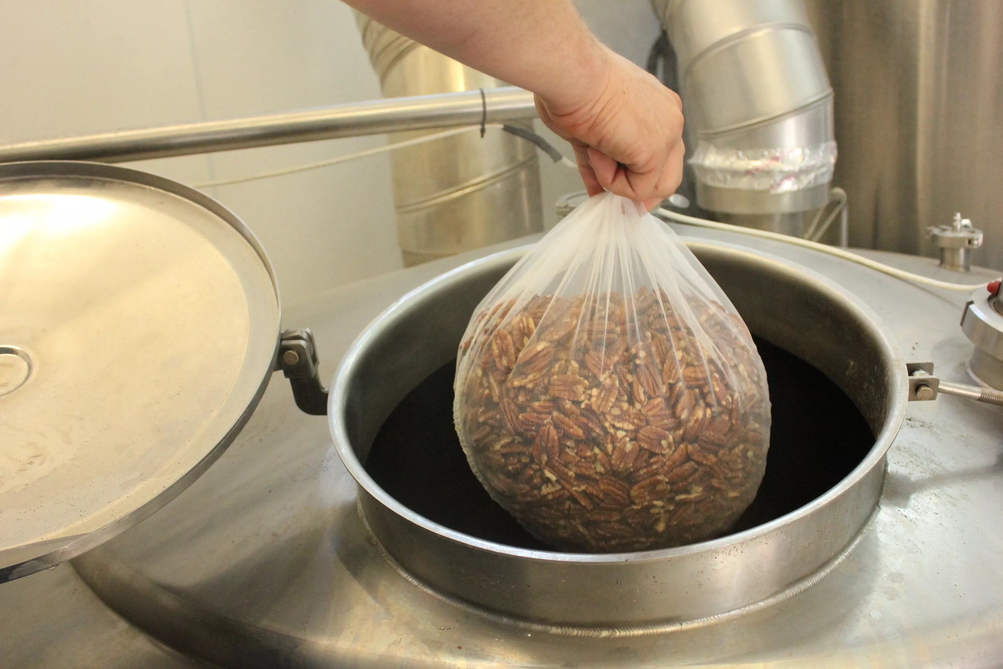 Thoeny signals he’s ready to add the pecans. He scoops them into loose nylon bags that look like tea sachets. Toting these, he climbs a ladder to a landing level with an opening in the top of the boil kettle.