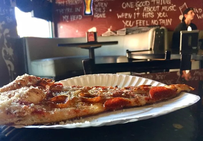 The name says it all at this Mesa strip-mall joint: The slices ($3) are huge, more like whole pizzas shaped like a slice and served with their own pizza cutter. Not gourmet ‘za, by any means, but the crispy seasoned crust and signature sauce are sure to satisfy nonetheless.