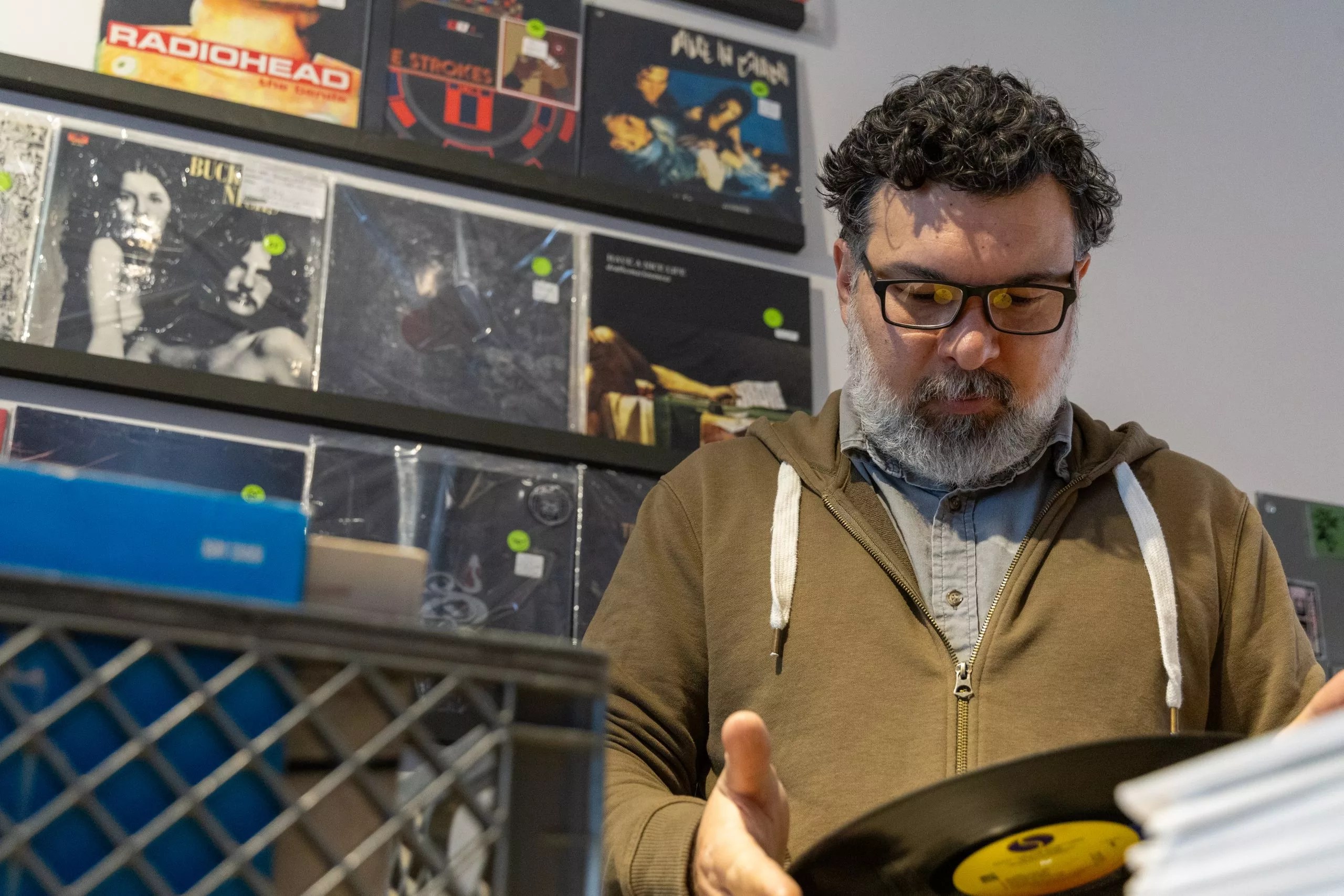 Dario Miranda, who works for Stinkweeds Records, inspects a crate of used vinyls for resale at the store.