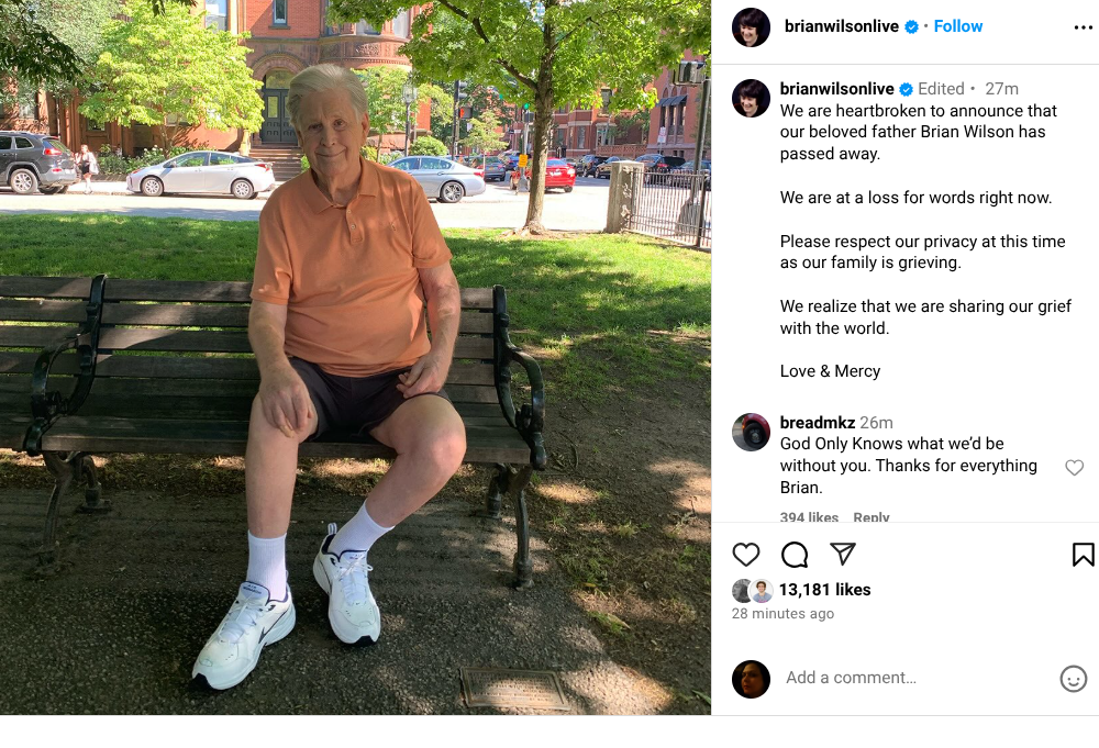 His family posted an announcement on Instagram on Wednesday, June 11, to share the news with the public and request their need for privacy, as well as a similar message on the official Facebook page, saying, “We’re heartbroken to announce that our beloved father Brian Wilson has passed away,” his family wrote in a statement shared on Wilson’sicial Facebook. “We’re at a loss for words right now. Please respect our privacy at this time as our family is grieving. We realize that we are sharing our grief with the world. Love & Mercy.”