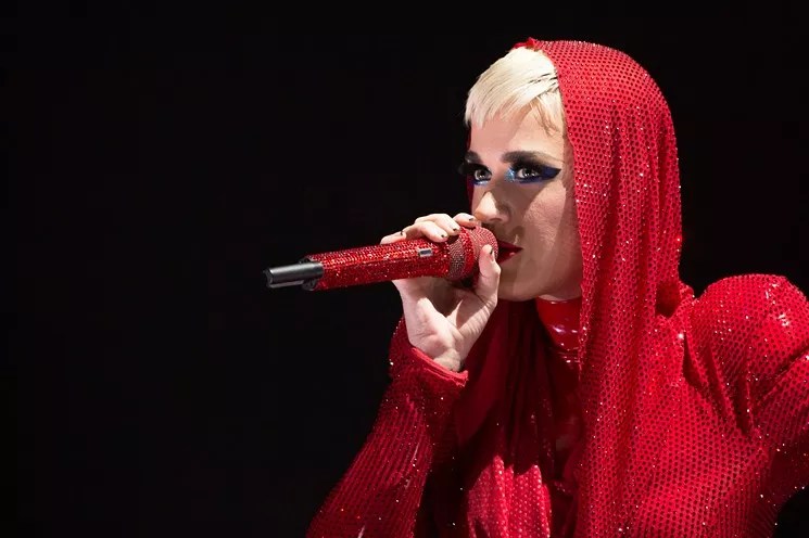 There are fireworks, a pole dancer, a massive set of lips that gobble up the singer, a massive tiger head for the song “Roar,” a pair of dice that singers dance on, a planet she rides over her the audience while strumming an acoustic guitar; and a ginormous basketball court where she battles in a game of hoops with a cool dad that’s handpicked from the crowd.