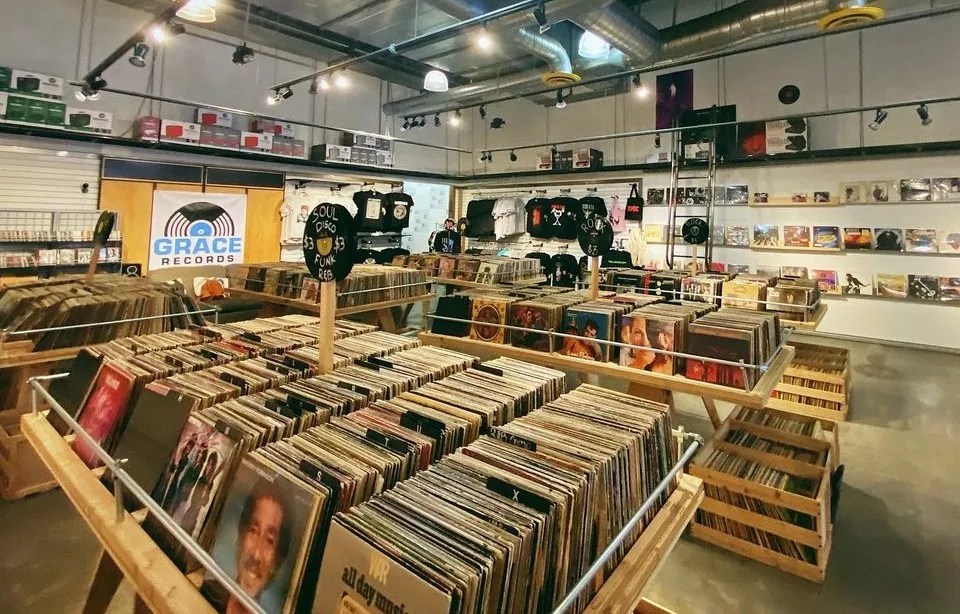 It opened in December 2017 with a focus on making collecting records affordable. The shop displays thousands of cheap used albums, with entire sections in multiple genres marked at $3 per record, making it easy for anyone to start building a collection. Grace also stocks new releases and reissues in vinyl, as well as a few used CDs. The shop sells record equipment, including speakers and turntables, in a range of quality levels and price points.