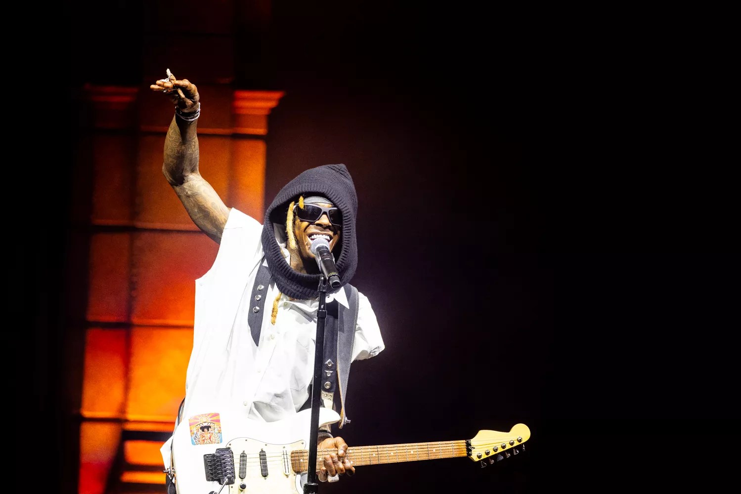 To be honest, Lil Wayne’s set didn’t get off to the best start. Standing in front of a microphone, face partially covered by a hoodie, smoking a blunt, holding a guitar, Wayne seemed a bit standoffish and low-energy for the first few songs.
