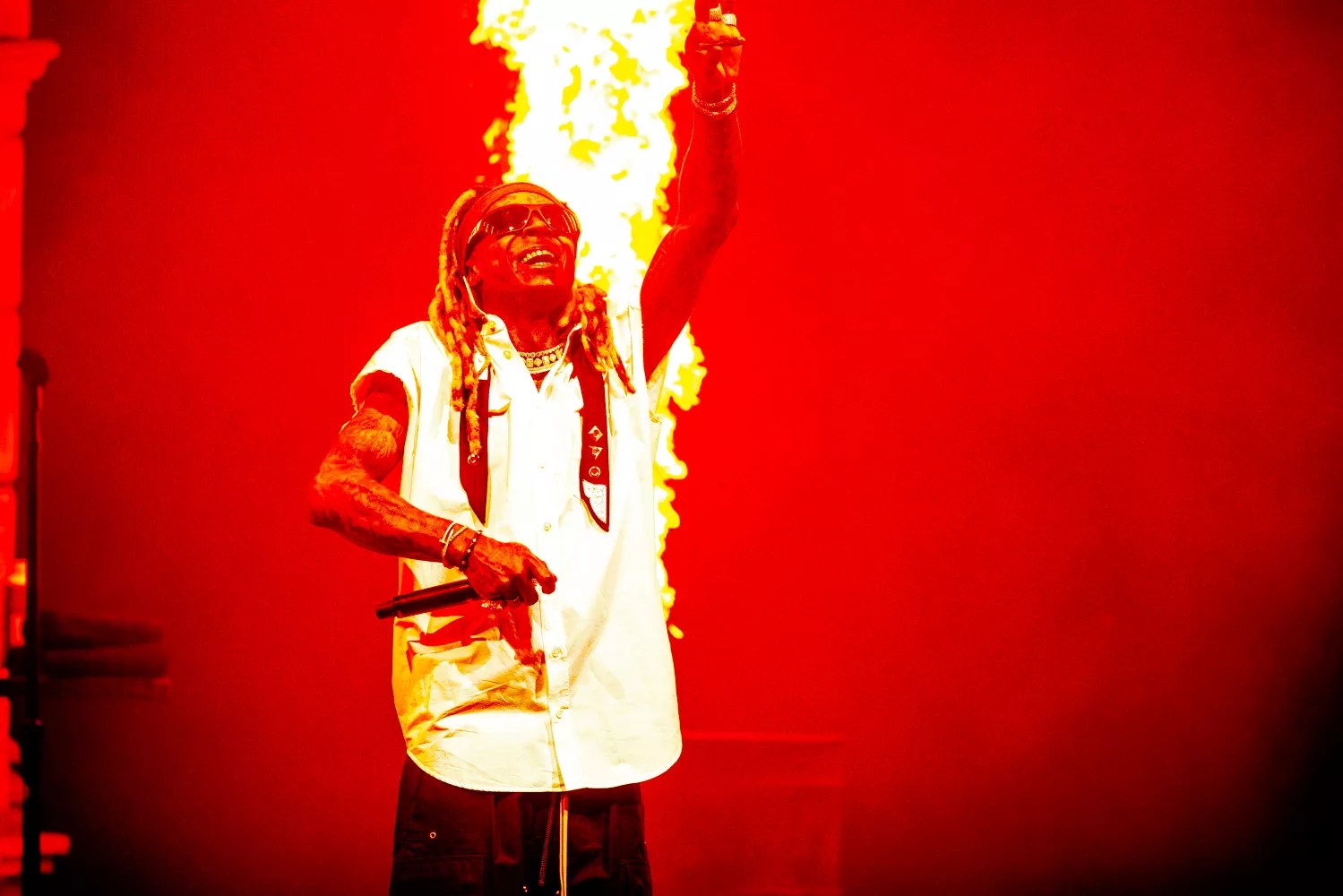 Then Dwayne Carter was off to the races, putting on a raucous, high-energy show punctuated by fireballs galore, bold graphics and onstage guests.