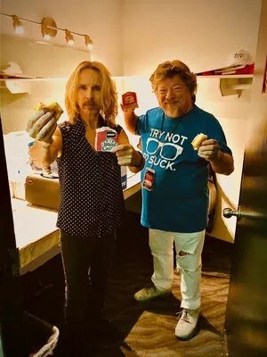 Tommy Shaw of Styx and Zelisko flash their White Castle burgers backstage.