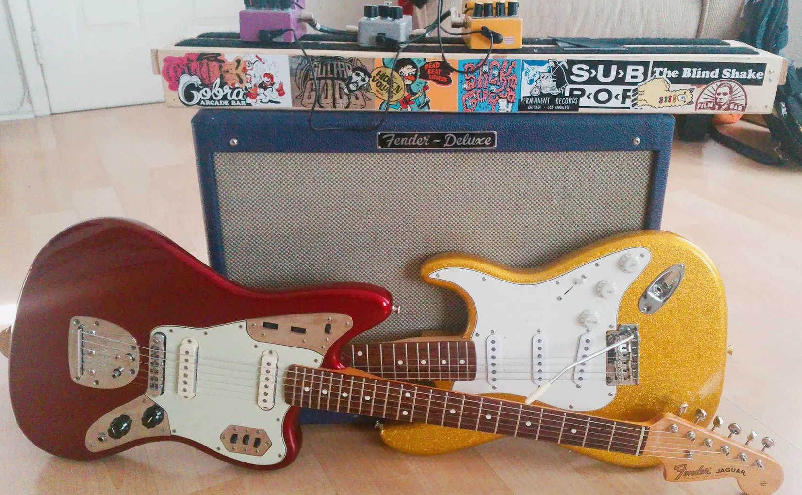 I once met Fred Gretsch Jr. years ago at a luncheon, and he asked what I played. I said a Jag, and he goes, “We need to get you a Gretsch!” Before I knew it, I had a Gretsch on order for me! They said I could pick anything I wanted. I should have picked the White Falcon! [But] I was humble and thankful and picked something not so pricey. I am not big on having a lot of stuff around. I love stuff, but just not in my environment. I don’t like clutter. So over the years I’ve smashed a lot of Jacksons [and] Squires, which is stupid. I don’t do that anymore. I didn’t think I was cool doing it or anything. I suppose at the time I thought it was funny. I wish I owned the perfect Mustang or Jag. I’d love to play a Mustang with heavy-sounding Jag pickups. Recently, I like my gold sparkled Strat. It does neat experimental weird sounds with the tremelo arm.