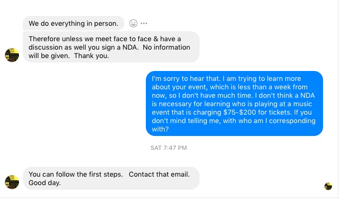 New Times attempted to contact organizers through phone, email, and Facebook Messenger. A Messenger reply from the festival’s Facebook page was received on Saturday evening, with the email address for a person named Gio from Jackfruit Studios. We were then asked via Messenger if we were available to meet in person this week. Upon learning it was not possible, the person corresponding on behalf of the festival’s Facebook page sent the following message: