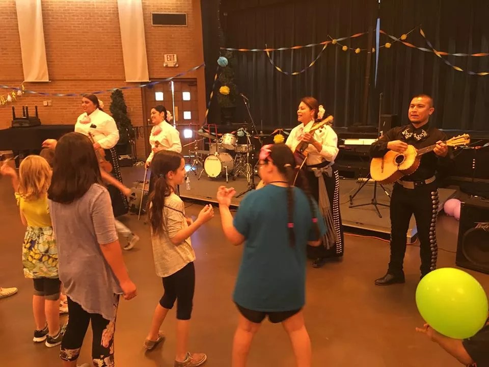 Campers dance with Mariachi Pasion during a lunchtime performance.