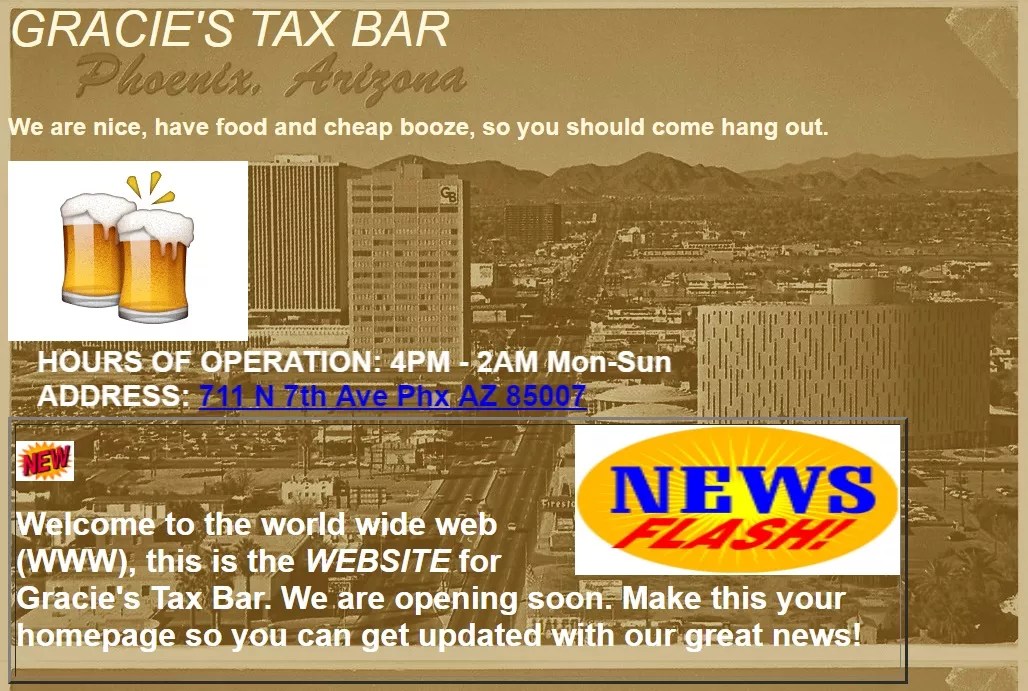 The GeoCities-like website of Gracie’s Tax Bar, complete with an embedded MIDI soundtrack.