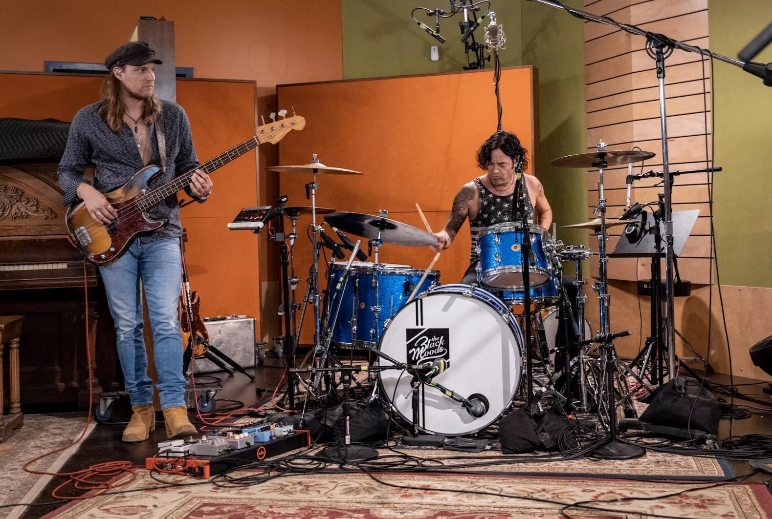 Jordan Hoffman, left, and Chico Diaz focus during the “Roadhouse Blues” studio session.
