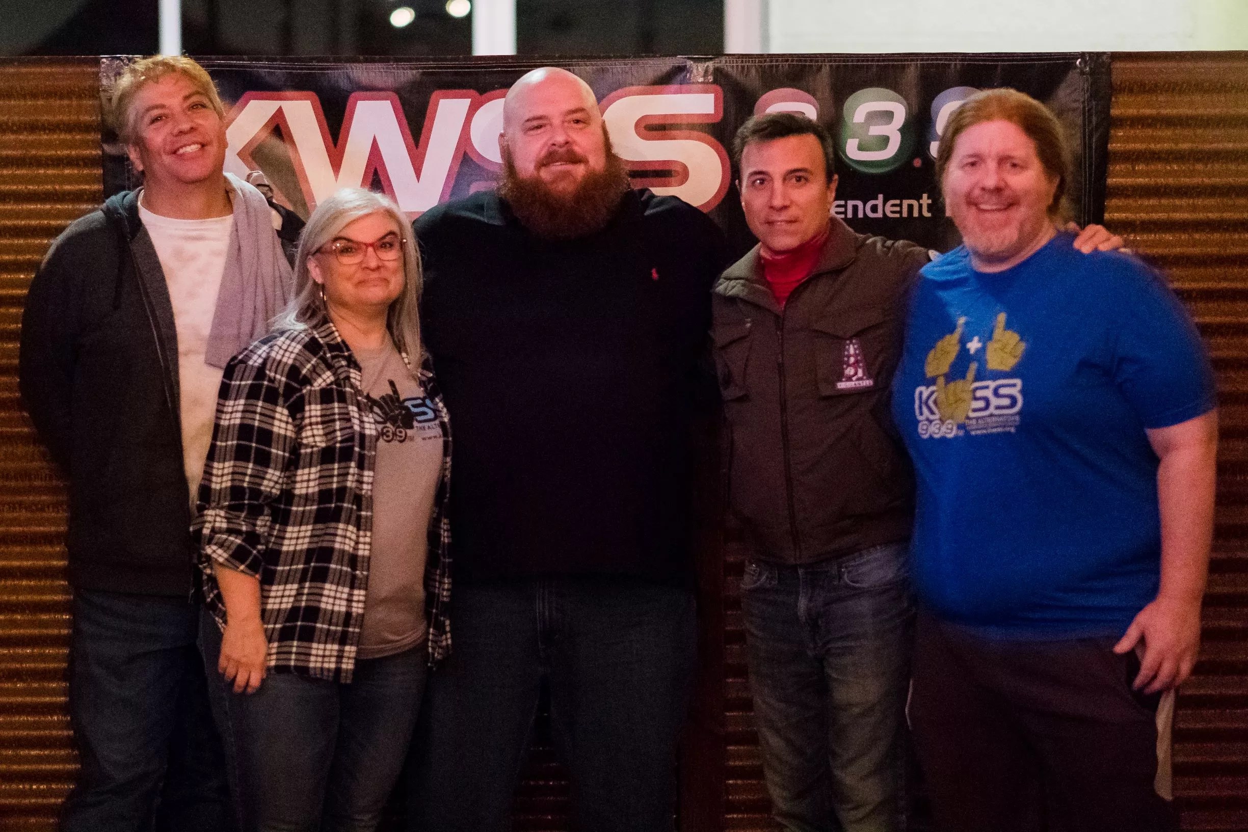 Some of the KWSS crew. From left are Jay Cairo, Dani Cutler, Dubs, Frank Magarelli, and Brian DeFox. Magarelli is the station's founder and owner; the others are volunteer radio hosts.