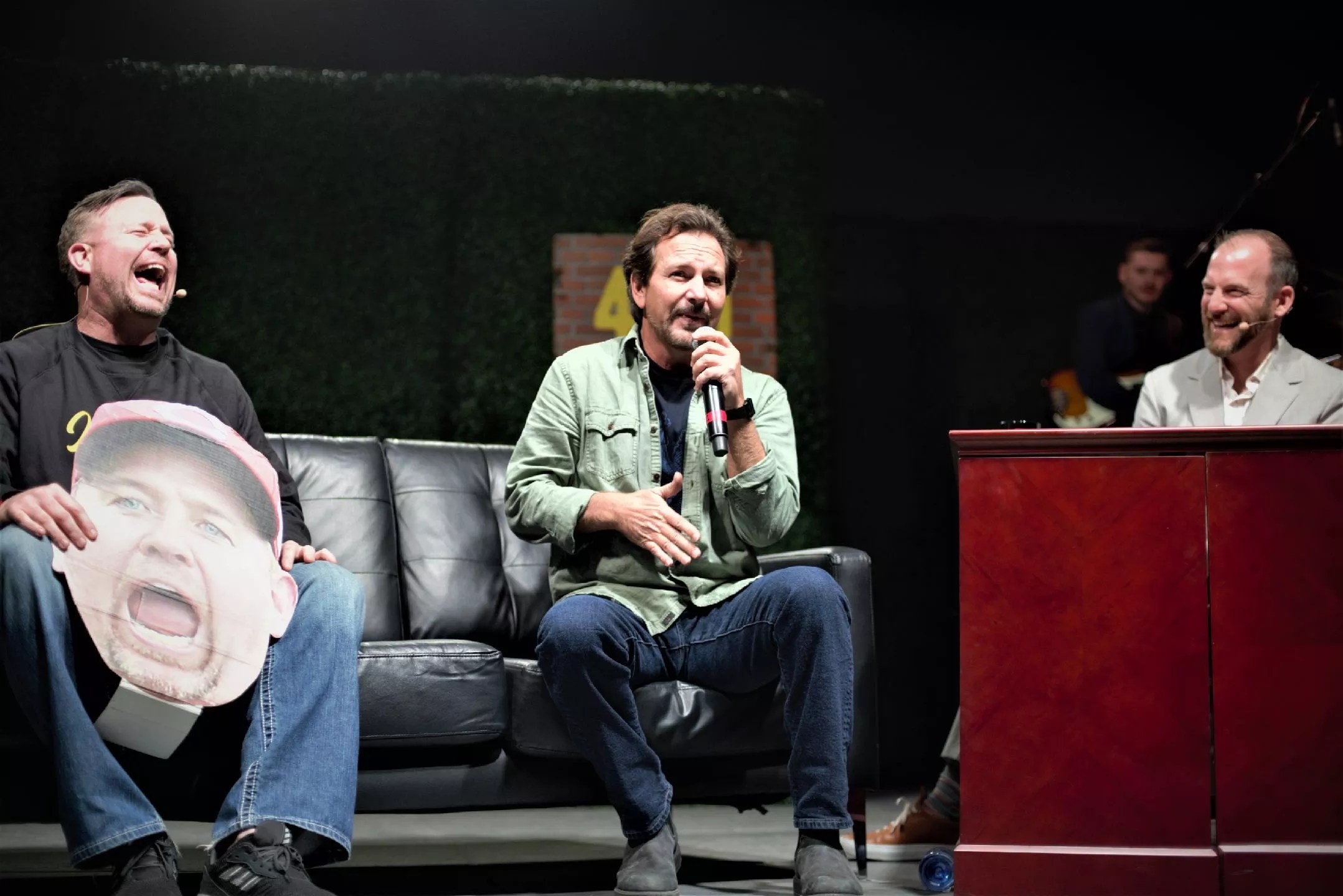 Sean Casey, left, and Eddie Vedder, center, talk with Ryan Dempster Off the Mound.