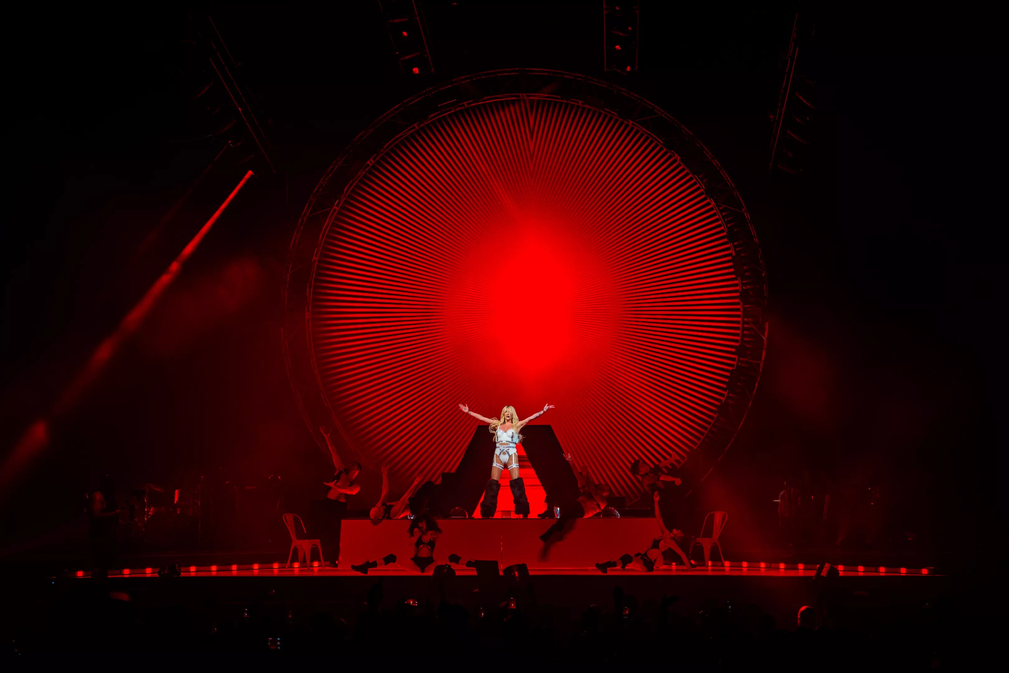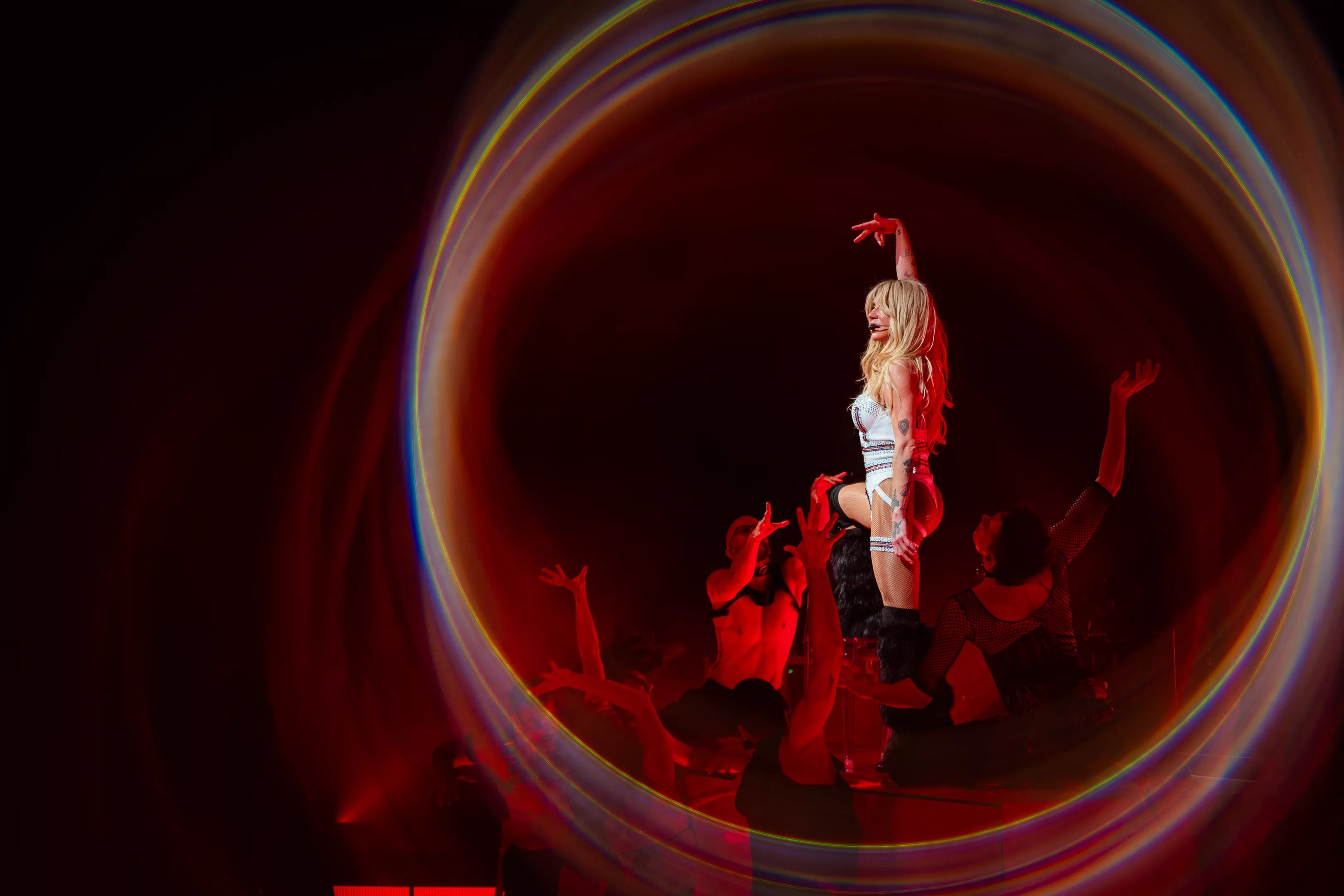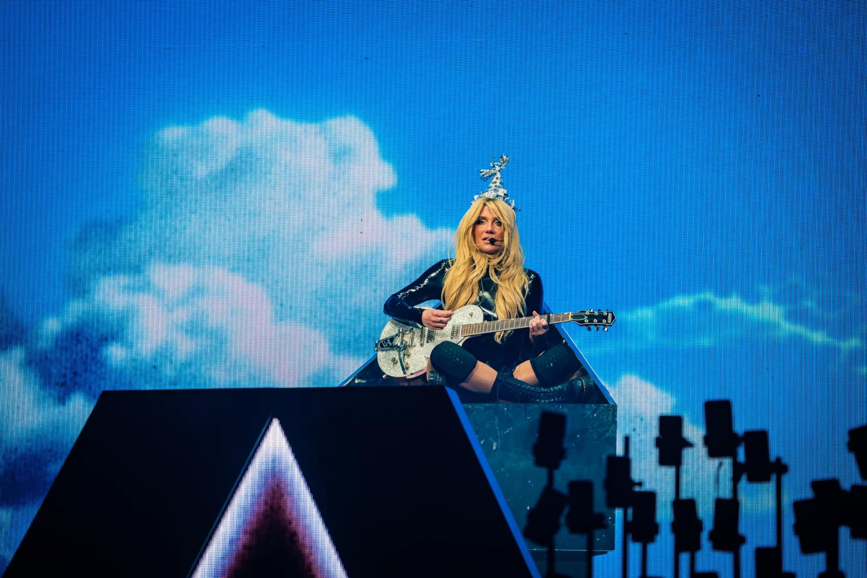 However, this fun, carefree energy during this set is short-lived, as her recent album track “The Drama” shows her being bound in a straitjacket while she sings about her self-destructive tendencies, and the word “abuse” flashes on the screen. She remains in the straitjacket as she’s roughly pushed around by her dancers, who are dressed like militia, while phone cameras film her during “Fine Line,” a song that details her experience in her personal and professional life during her 2023 lawsuit with Dr. Luke. The performance could be found triggering to those who have experienced abuse in their lives, but it ends with a profoundly inspiring message: her finding her own power in the light of fame. As “Ram Dass Interlude” plays, Kesha puts her hands in front of the phone camera on stage and pushes them away. These three performances form one of the strongest pieces of symbolism I’ve gotten to see live at a major pop show.