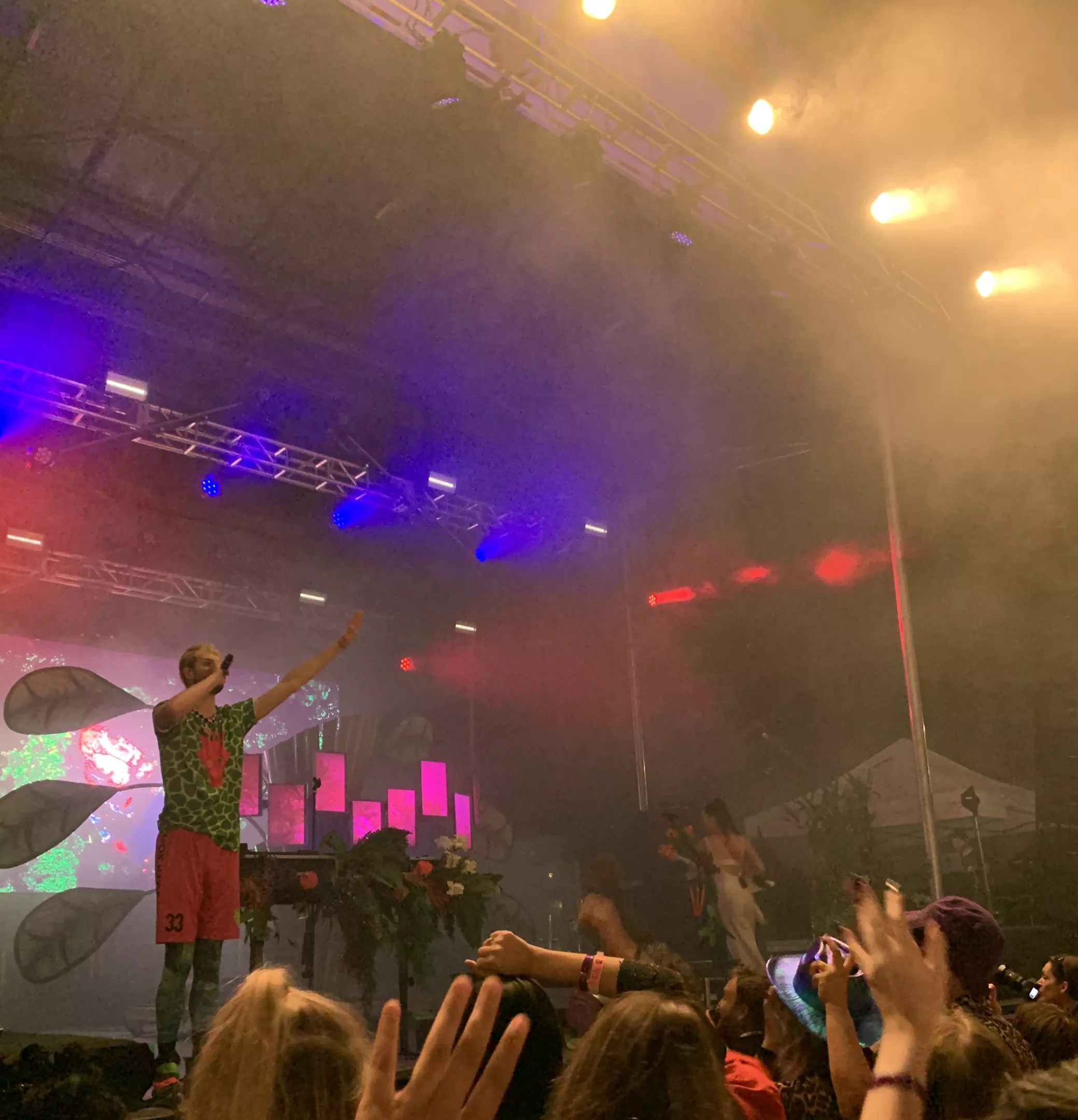 Festivalgoers started to head over to the Kesey Stage to see Sofi Tukker before The Growlers finished their set, and with the elaborately decorated stage that resembled the lair of Batman villain Poison Ivy, they knew they were in for an experience before the duo even took the stage. The ground shook and the audience moved as soon as Sophie Hawley-Weld played the first note on her guitar. Sofi Tukker with an organic-looking stage. Jason Keil