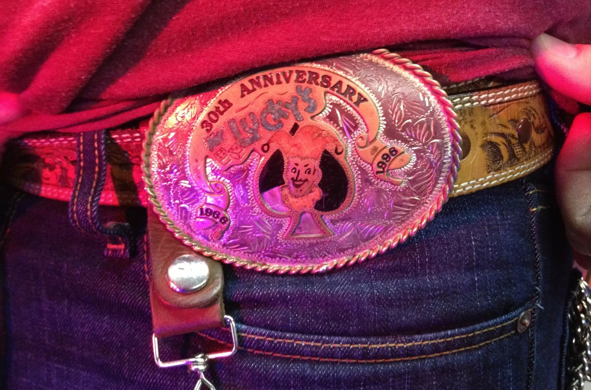 An ornate rodeo belt buckle from 1996 commemorating Mr. Lucky’s 30th anniversary.