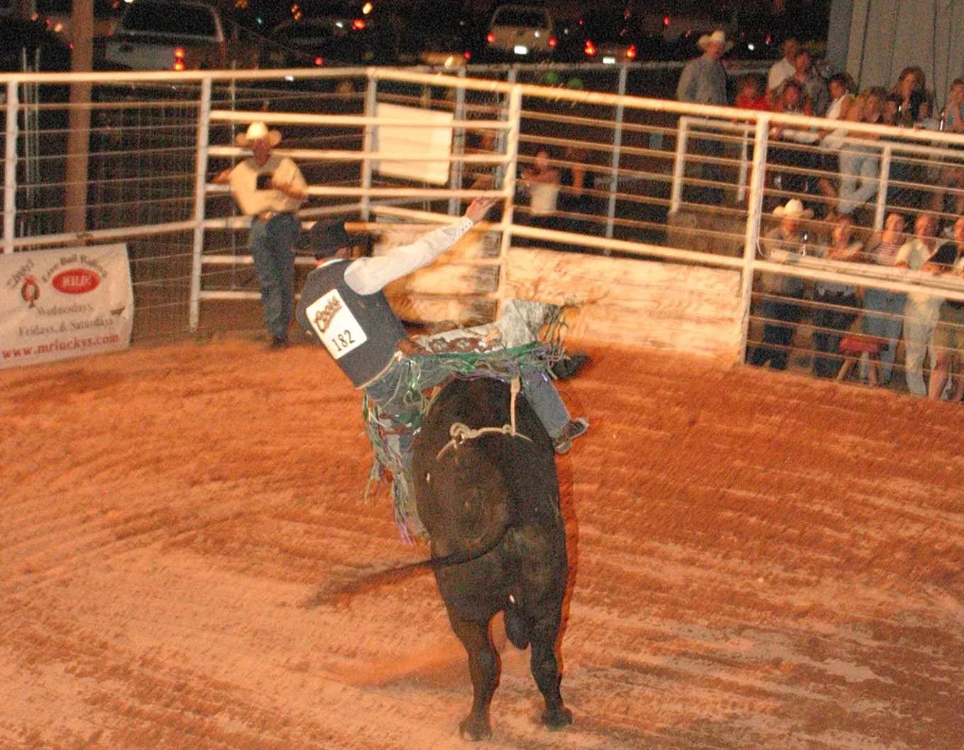 A local bullrider attempts to hang on while competing in Mr. Lucky’s outdoor rodeo arena.